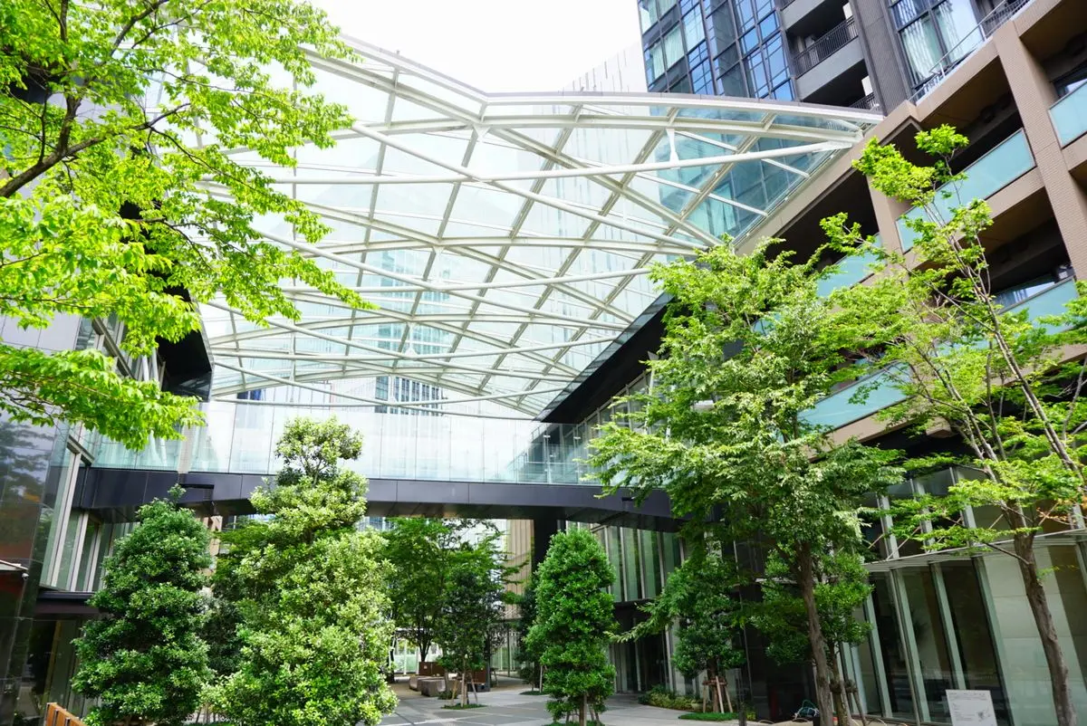 エントランス周辺はアトリウムプラザの自然な緑ゾーンが広がっており、爽快な雰囲気が感じられます。