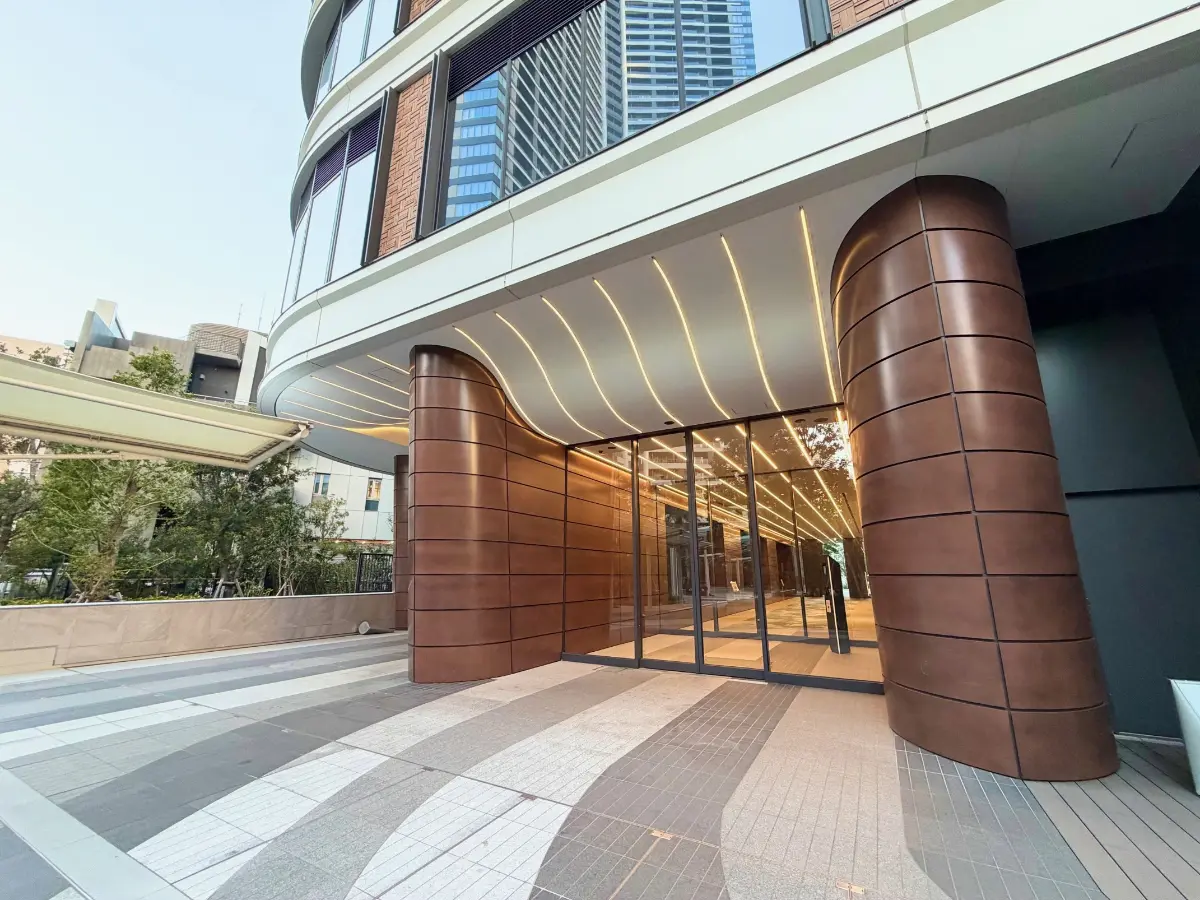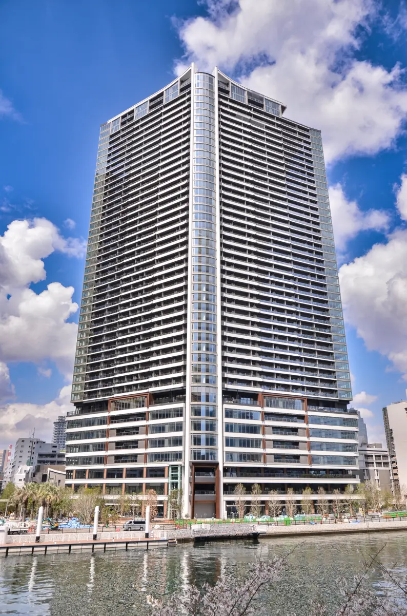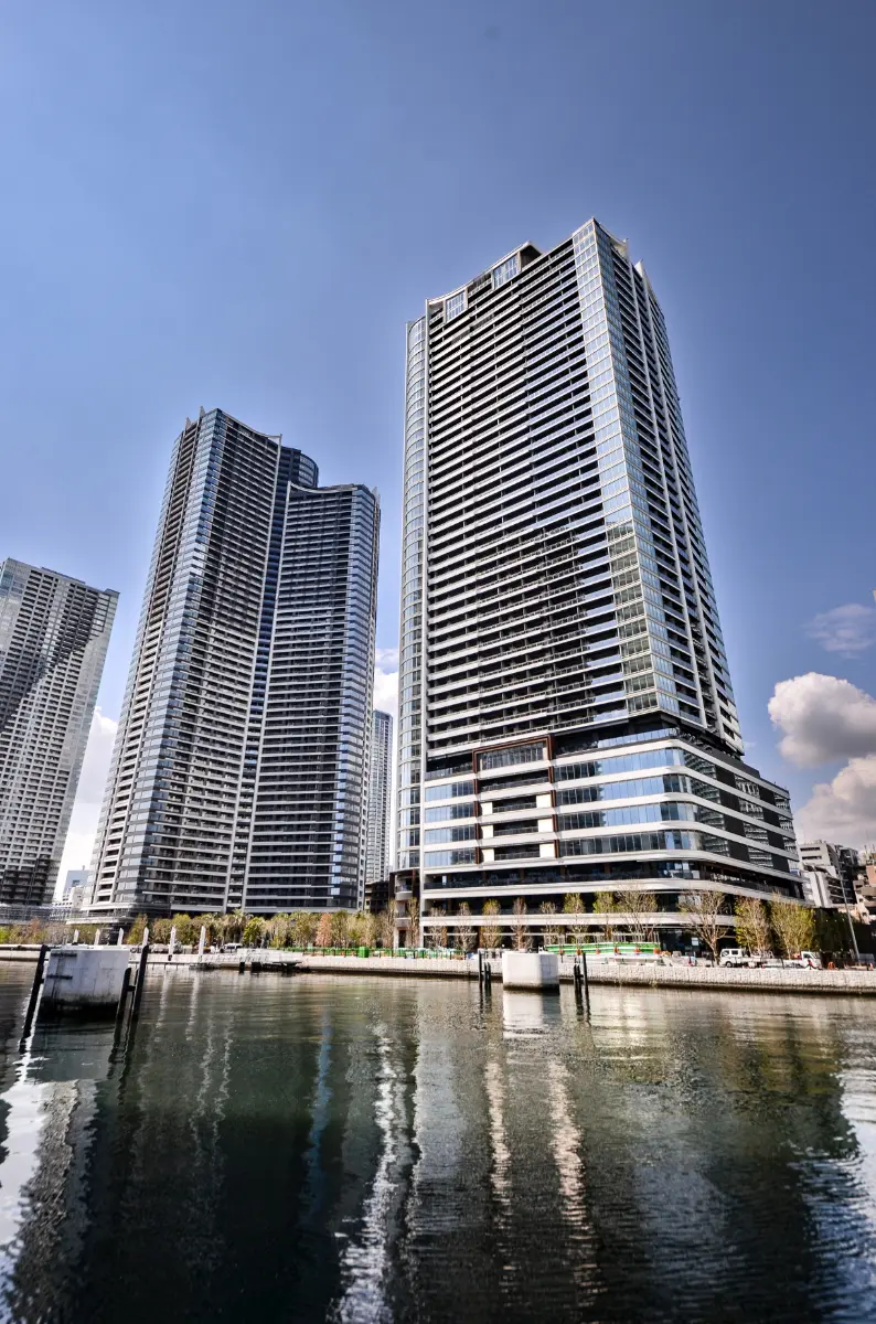水辺に囲まれリゾートのような外構空間は、勝どきエリアのランドマークとして佇みます。