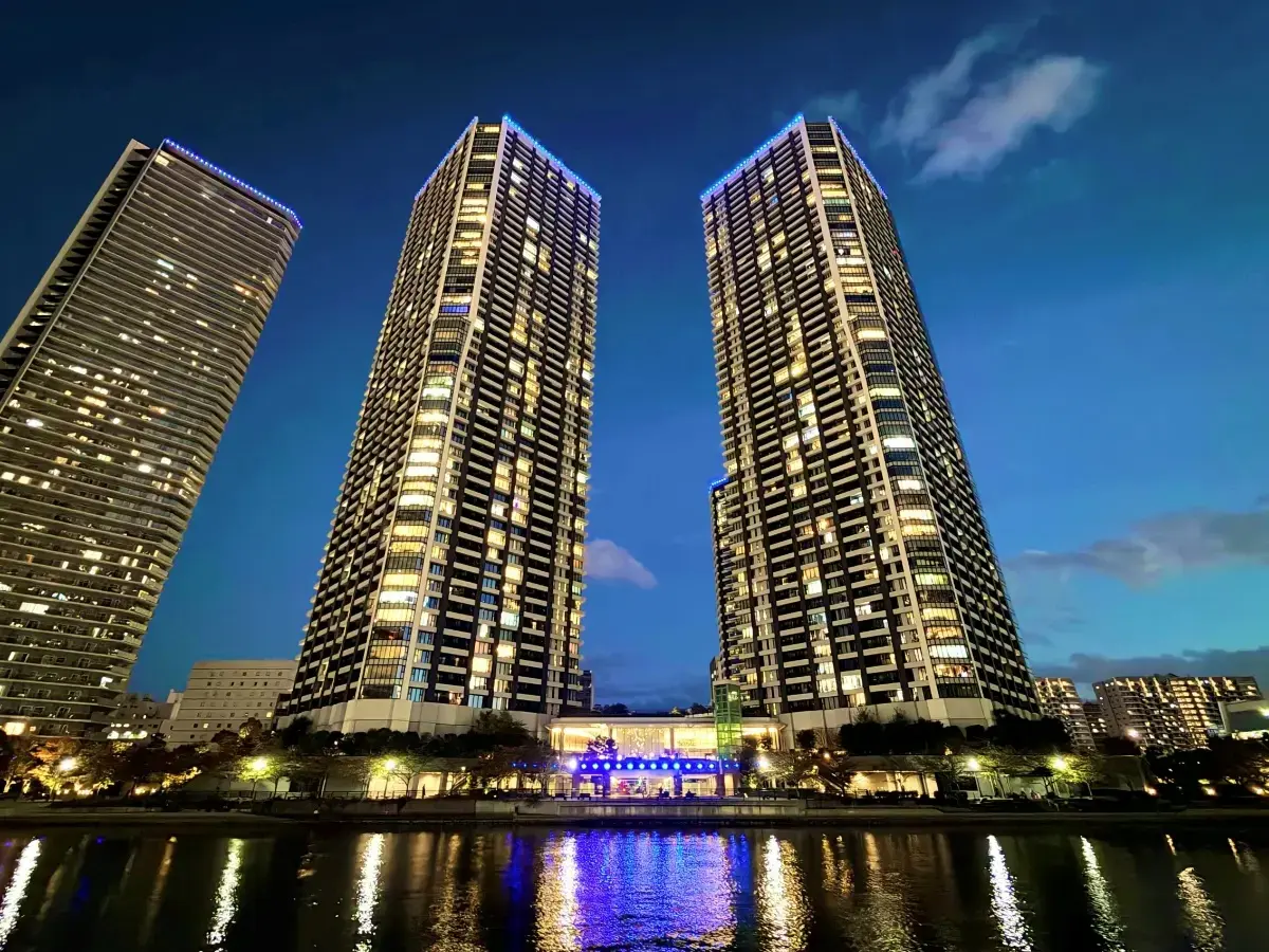 地上約180mのツインタワーはガラスを纏い、湾岸のランドマークとしての存在感を放ちます。