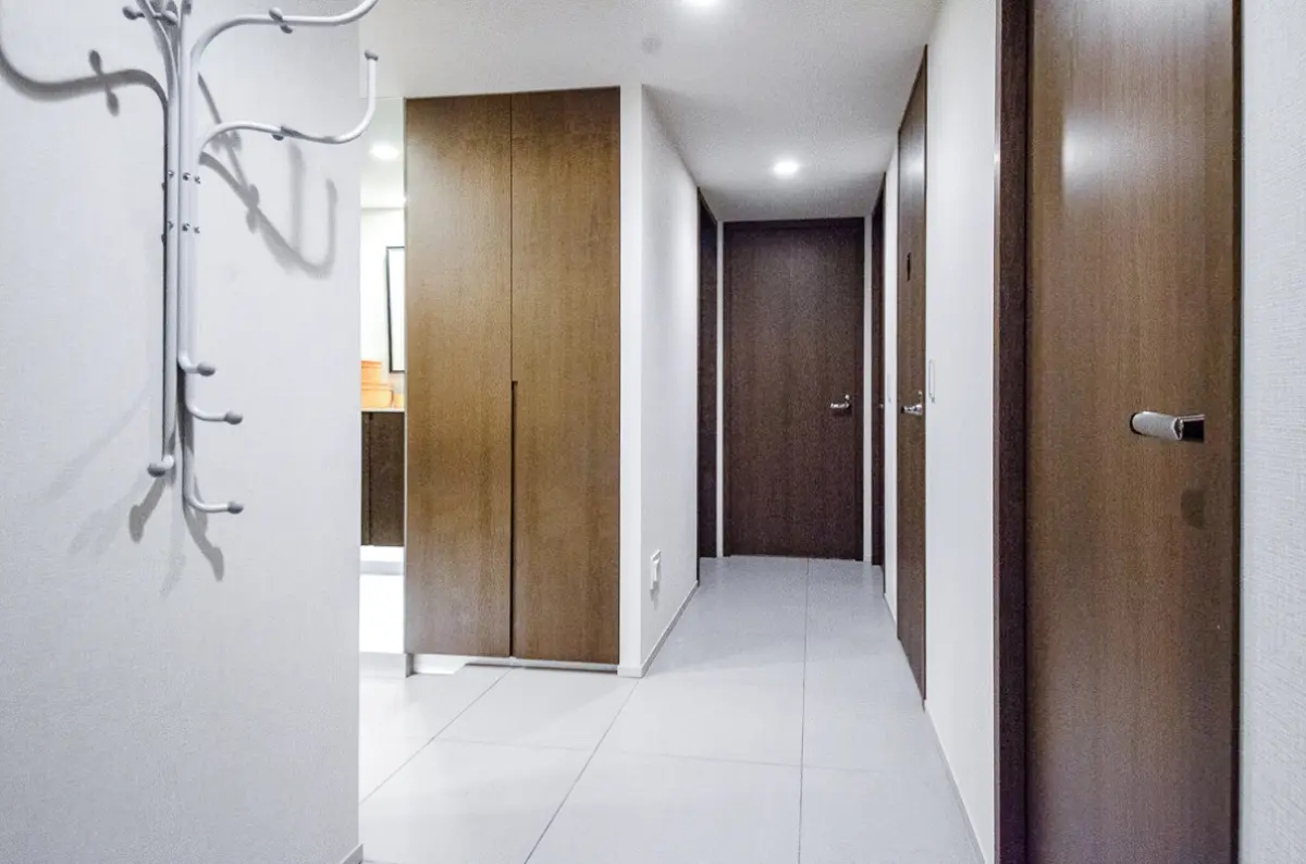 エントランスから各住戸まで続く共用廊下はホテルライクな内廊下設計で、居住者のプライバシーに配慮。