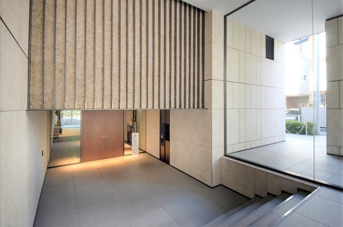 外観はグレーの大判タイル貼りに統一された、重厚感溢れるデザインです。エントランスホールは二層吹き抜けの大空間で、メインエントランスには車寄せも付いています。