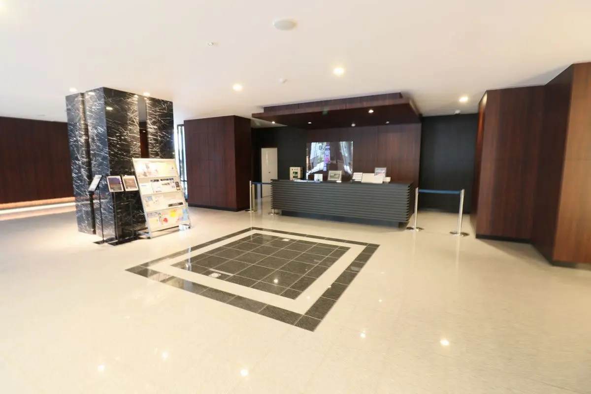 マンションのエントランスは床のタイルまで艶やかに輝くラグジュアリーな迎賓空間で、大きな空間に重厚感のあるソファーや気品あるチェアが設置されています。