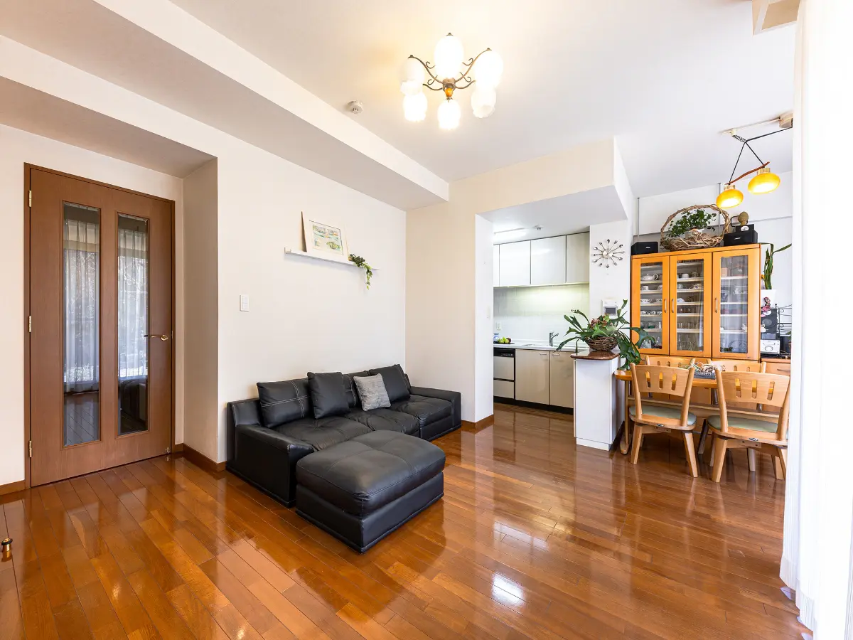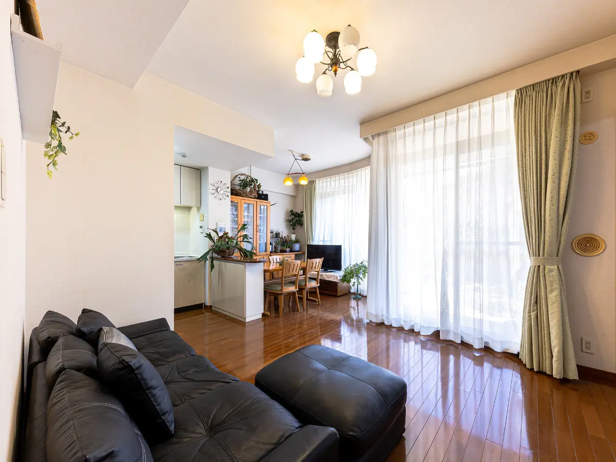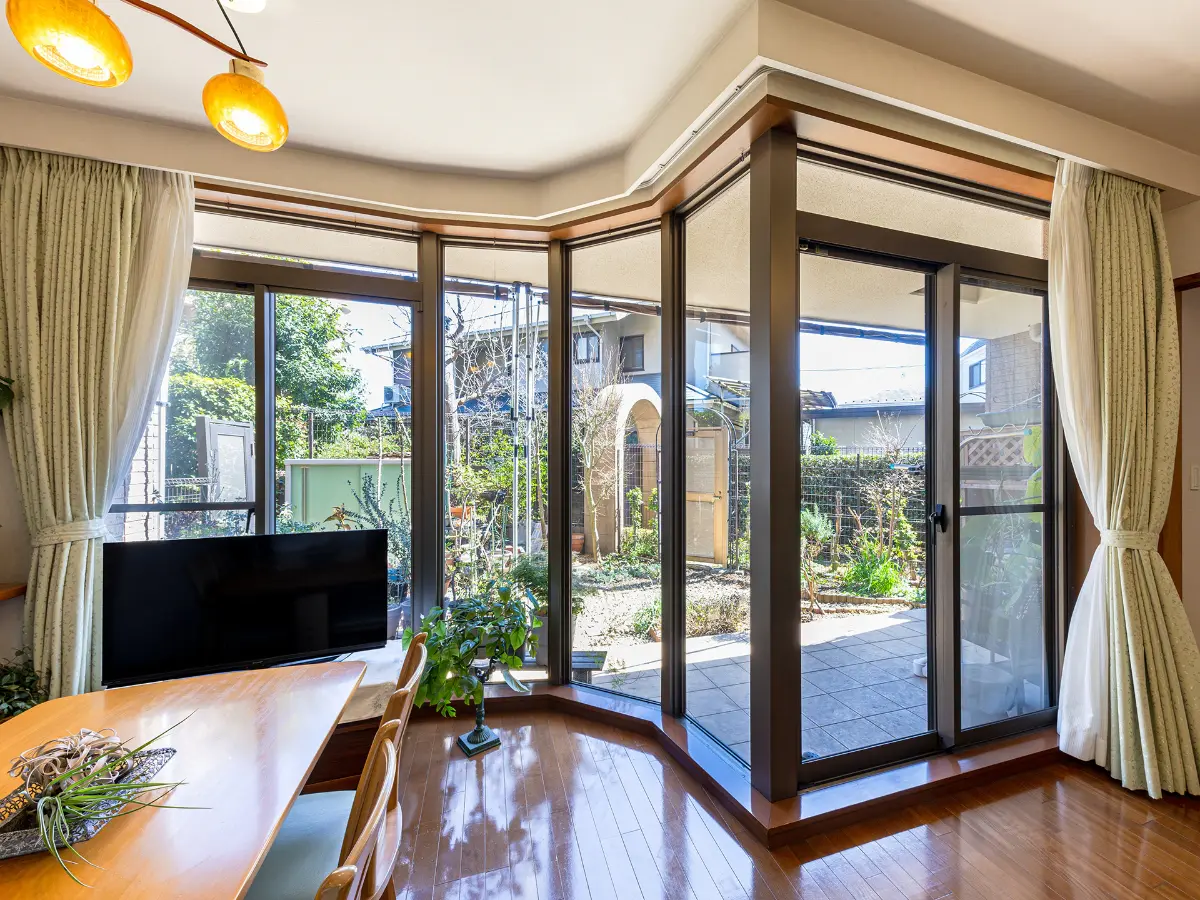 リビングダイニングには温水式床暖房を設置。パノラマウインドウが明るさと開放感をもたらし、室内にいながらテラスや専用庭との一体感を感じられます。