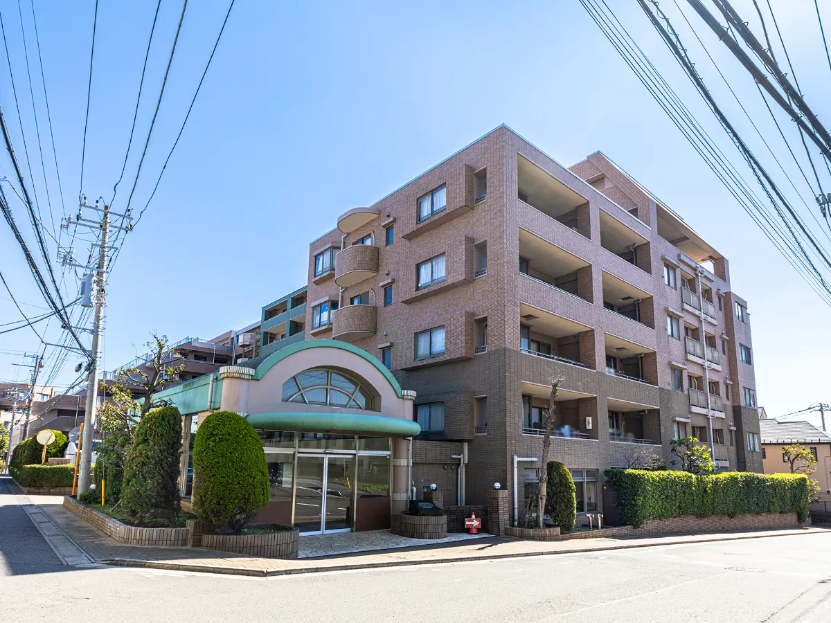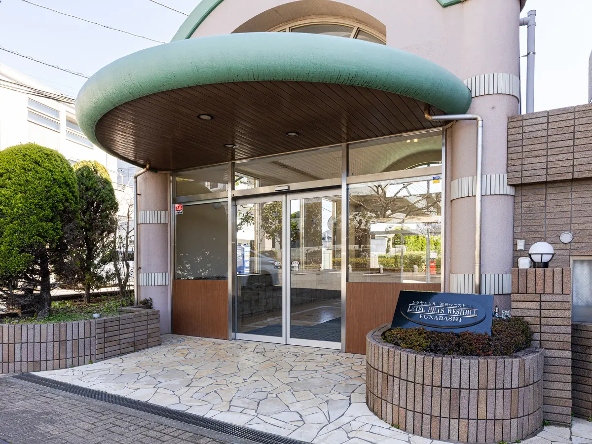 レクセルヒルズ船橋ウエストヒルのエントランスは、円柱とアーチ型の屋根、そして自然石をランダムに敷き詰めた床が印象的です。道路との境界には植栽が施され、緑豊かな雰囲気を演出しています。
