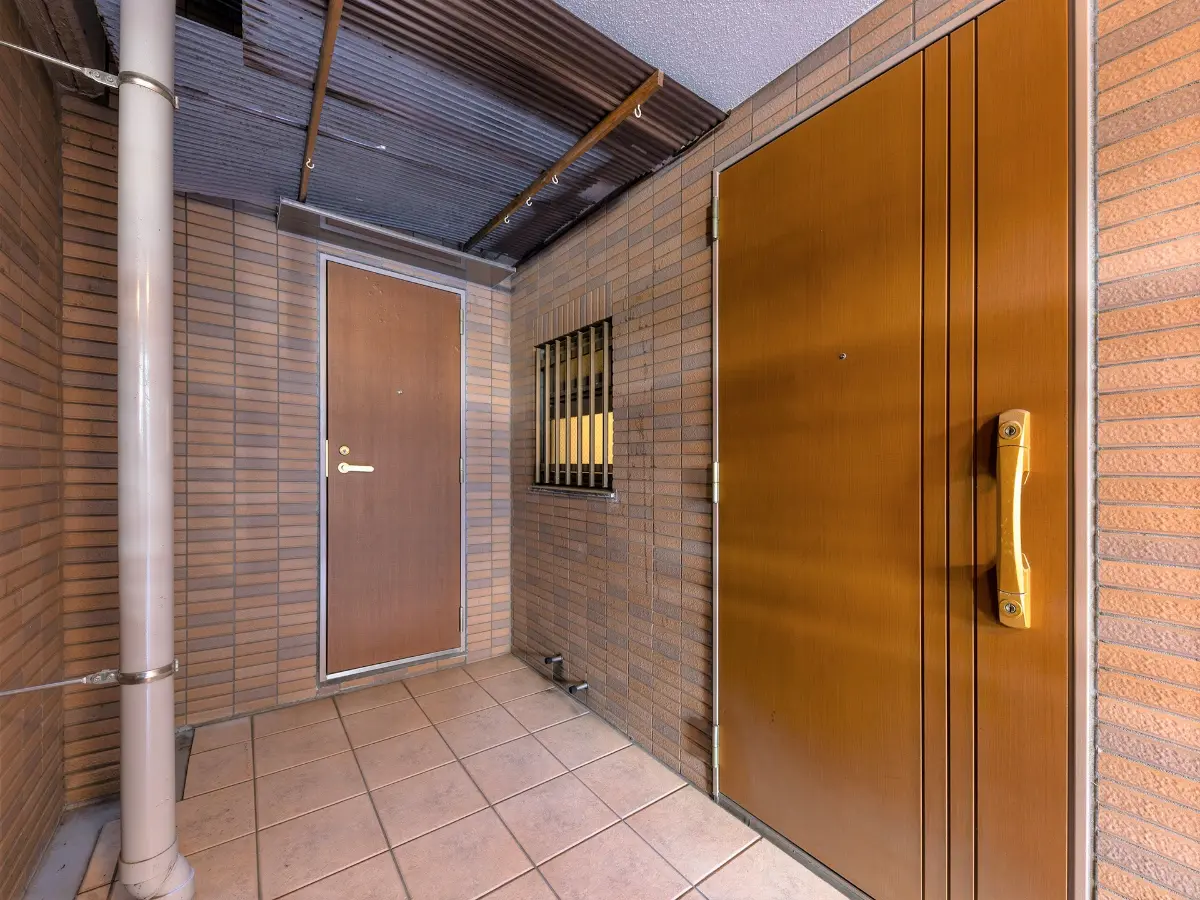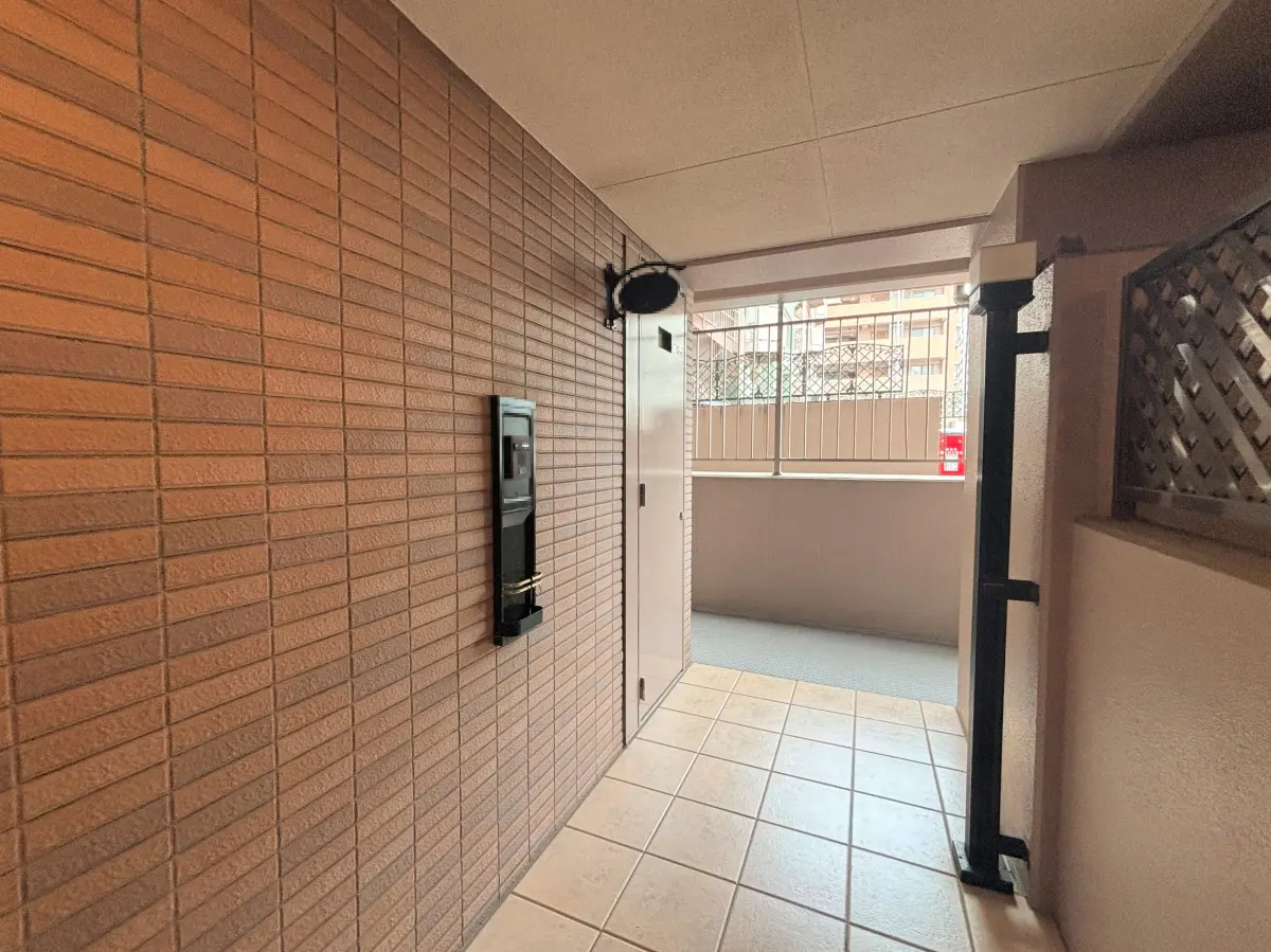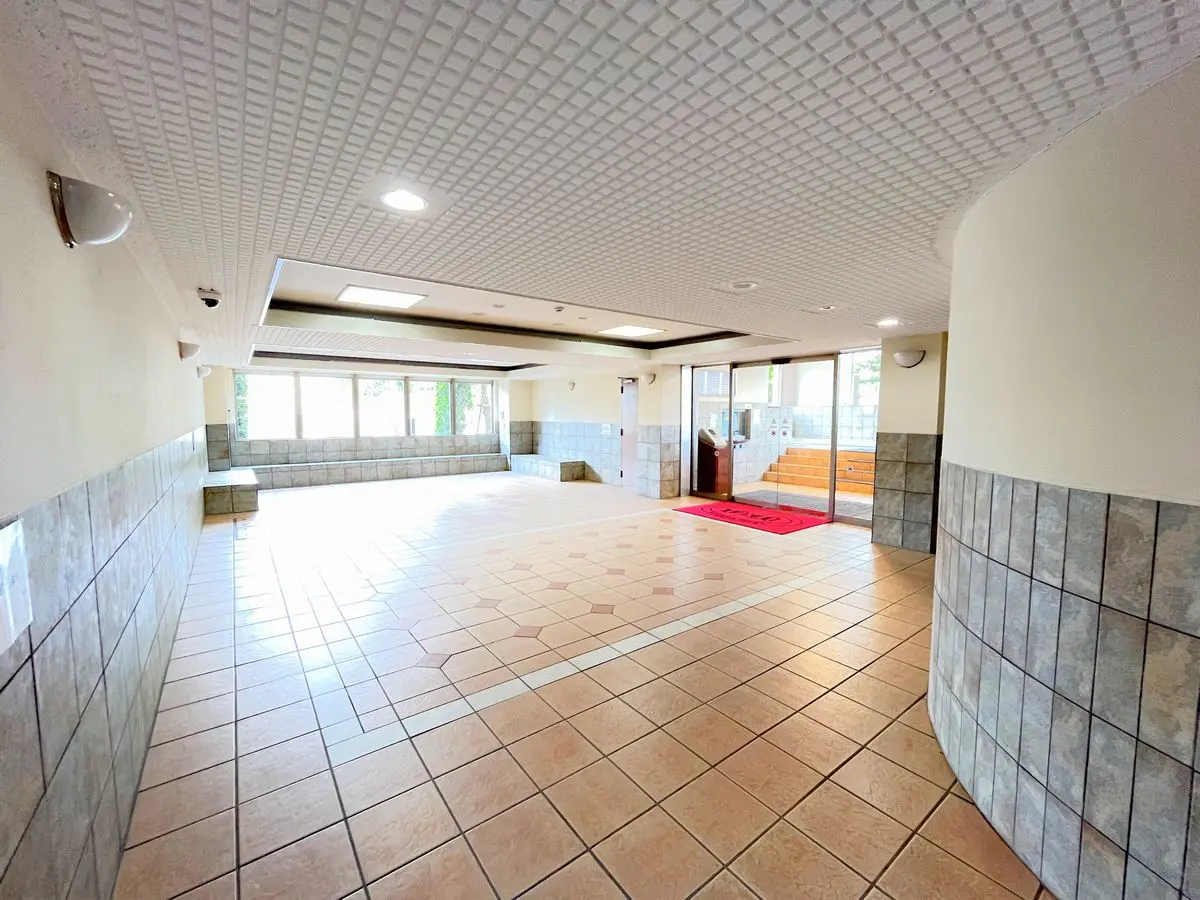 中へ入ると、アーチ型の高い天井とタイル貼りの内装が広がり、一般的な風除室とは異なるゆとりある空間が感じられます。風除室を通り抜けると駐車場につながります。