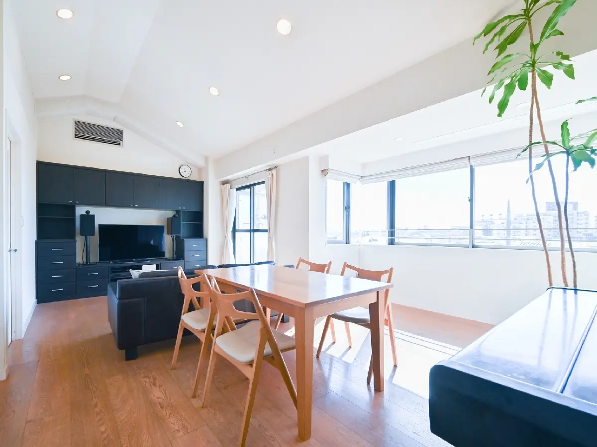 リビングダイニングはペントハウスの利点を活かし、天井高3550mmあるためとても開放的です。