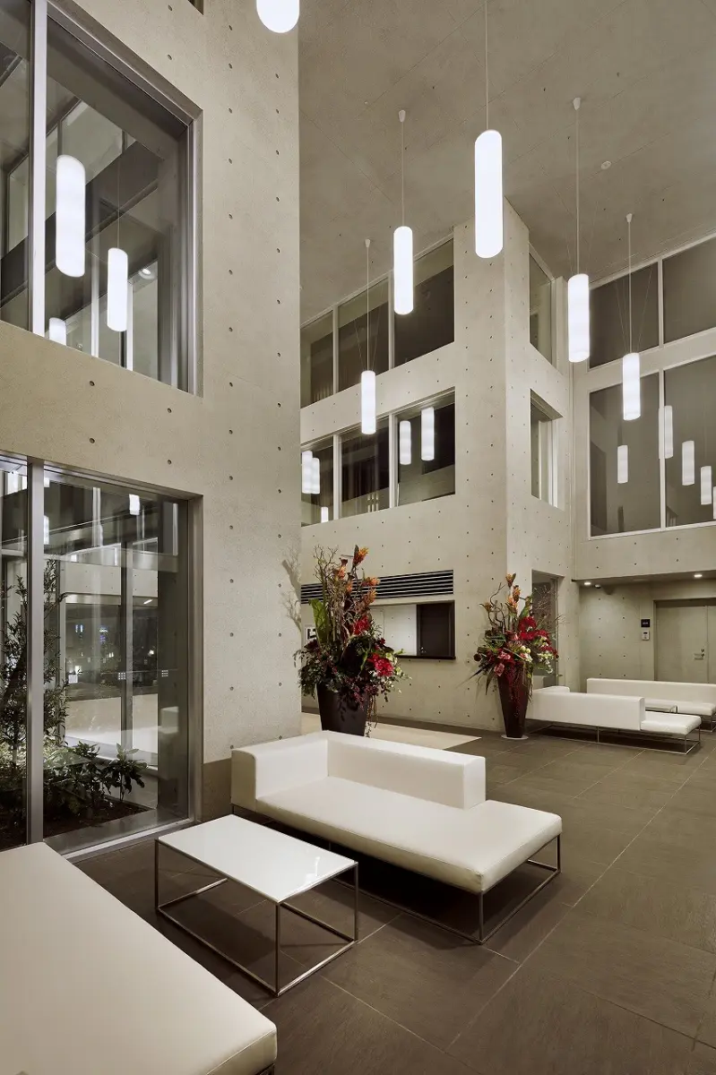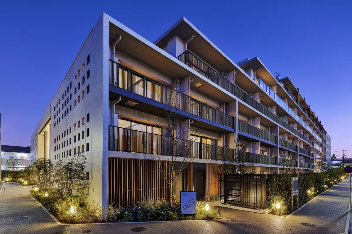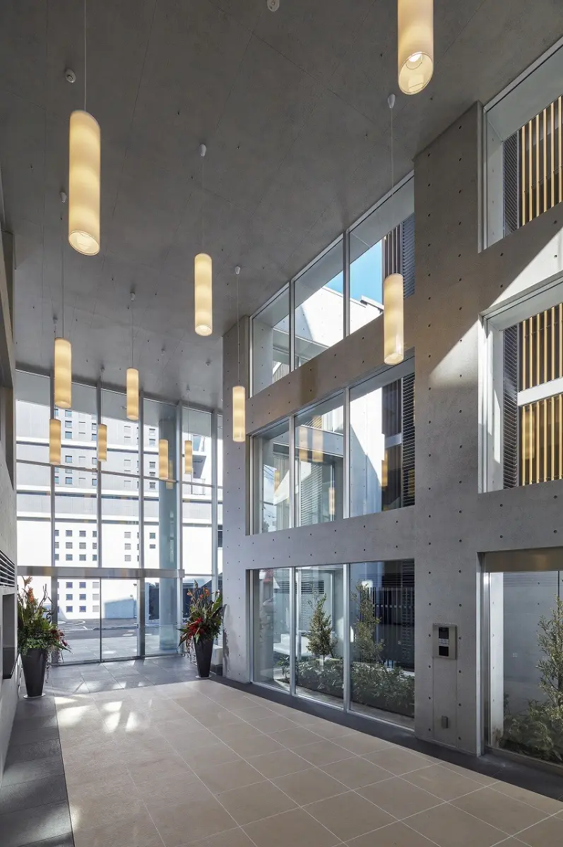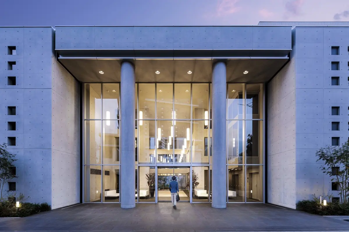 外観はコンクリート打ちっぱなし風の外壁や質感あるタイル、バルコニーのガラス手すりなど、異なるマテリアルが深みある表情をもたらします。