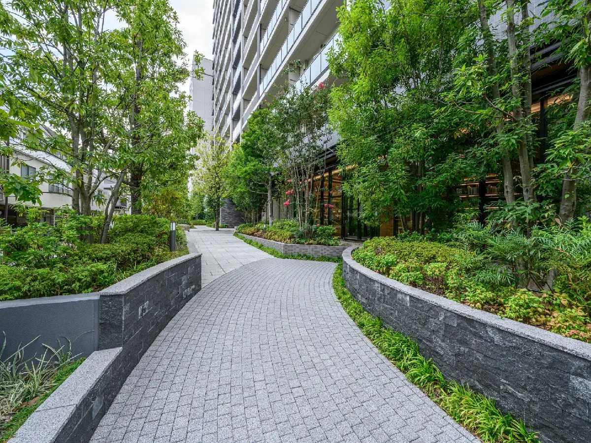 敷地入り口のフォレストゲートからエントランスをつなぐ緑のトンネルなど豊富な植栽が魅力的。