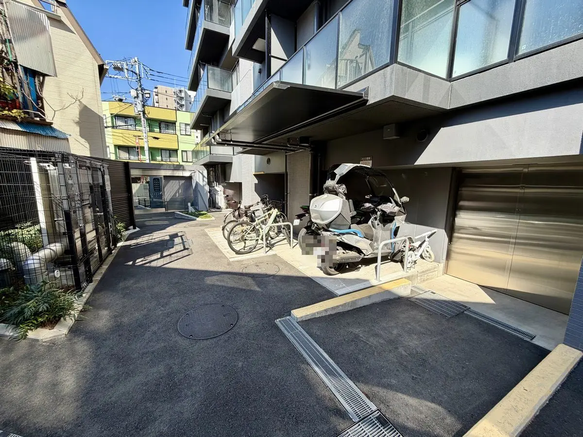 敷地の一部は山手通りに面していますが、山手通り側の敷地をゆったりとしたエントランスアプローチや自転車置き場にすることで、住棟を山手通りから遠ざけ、比較的閑静な環境を作り上げています。