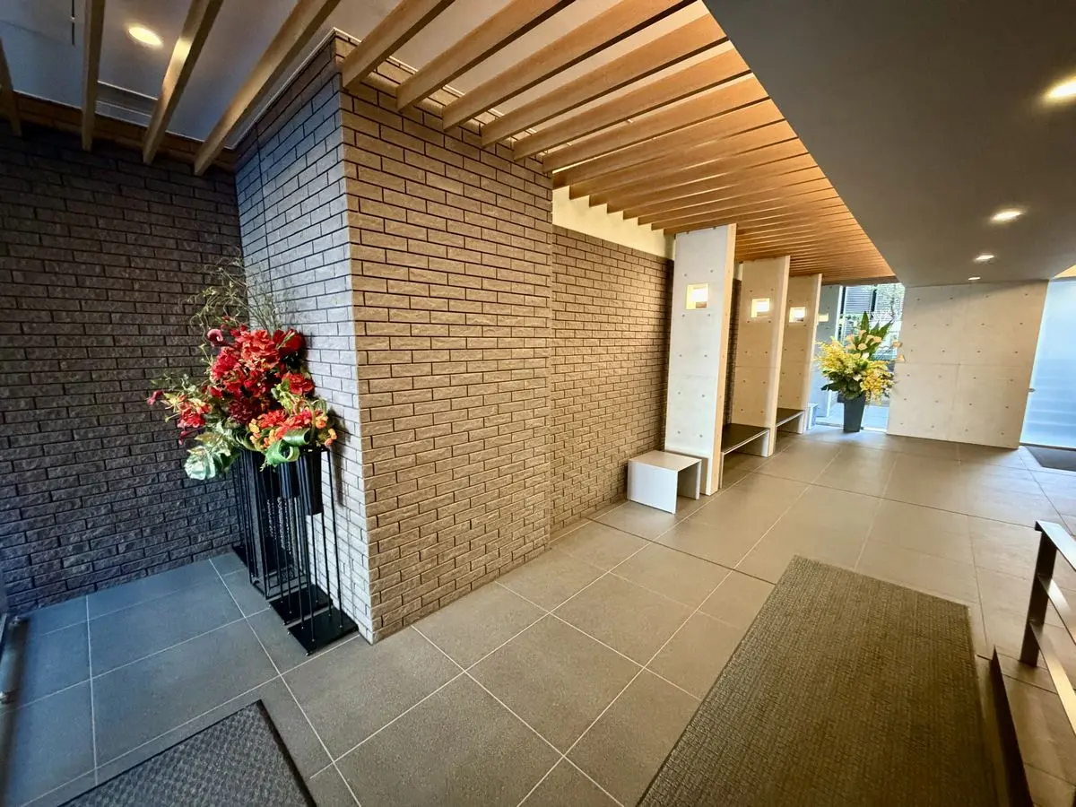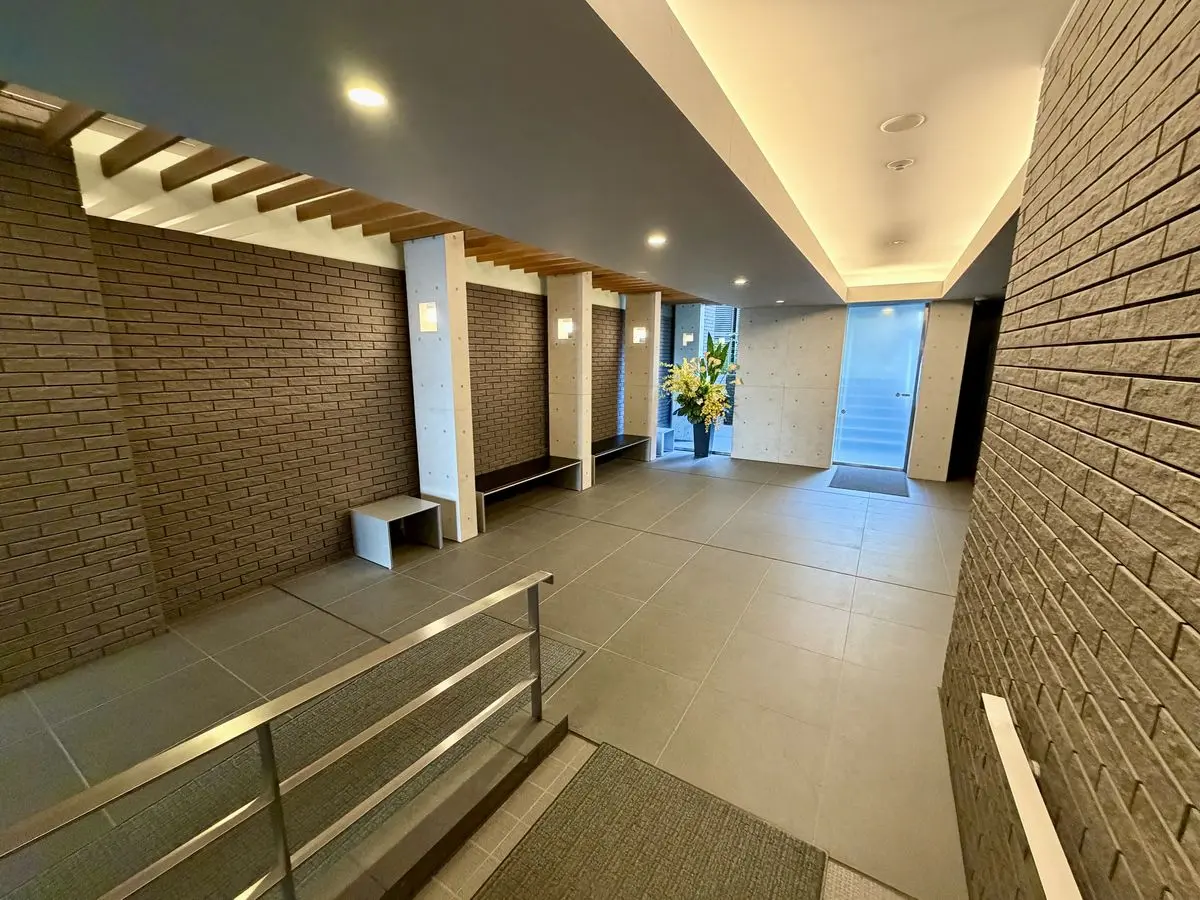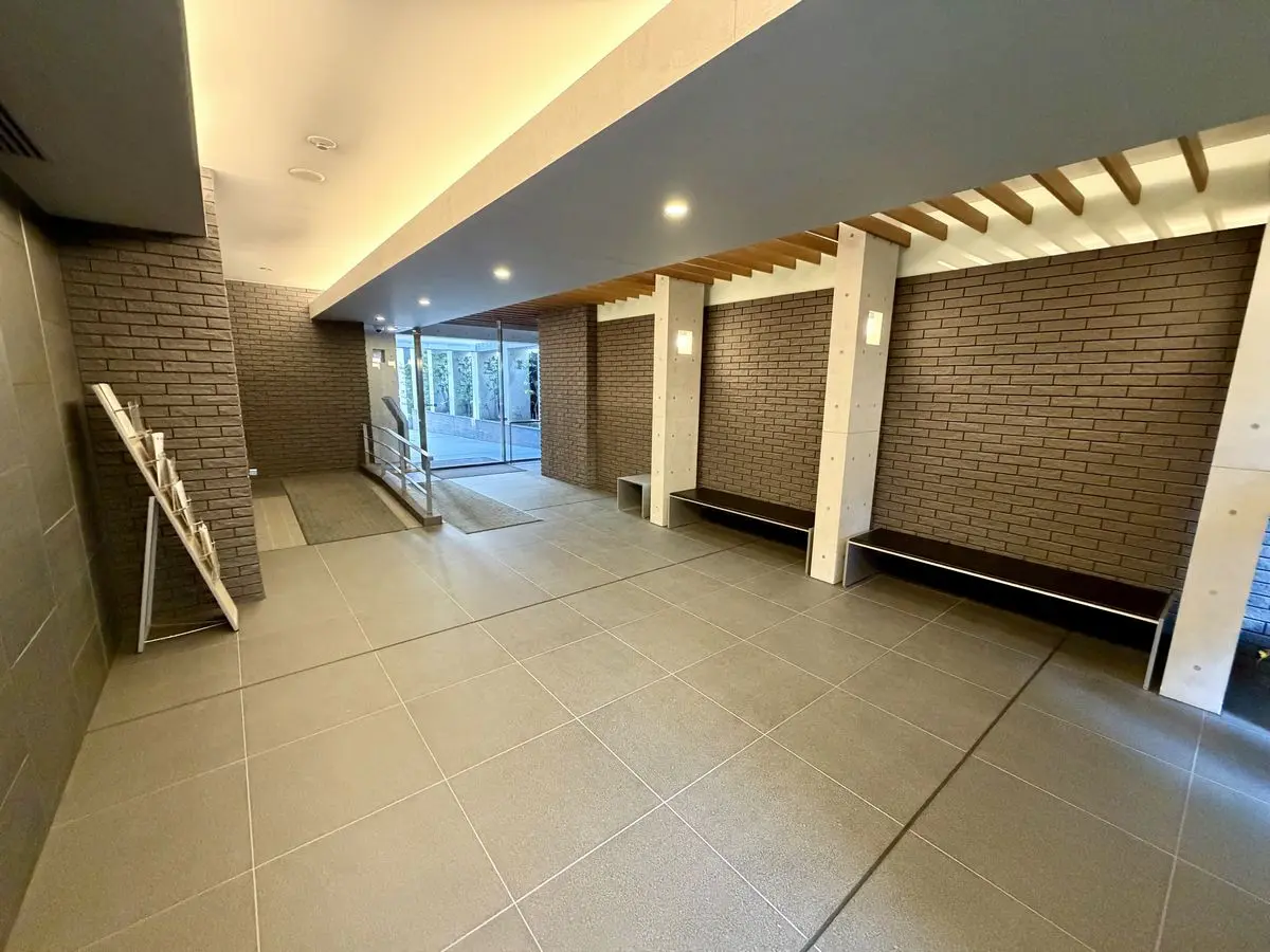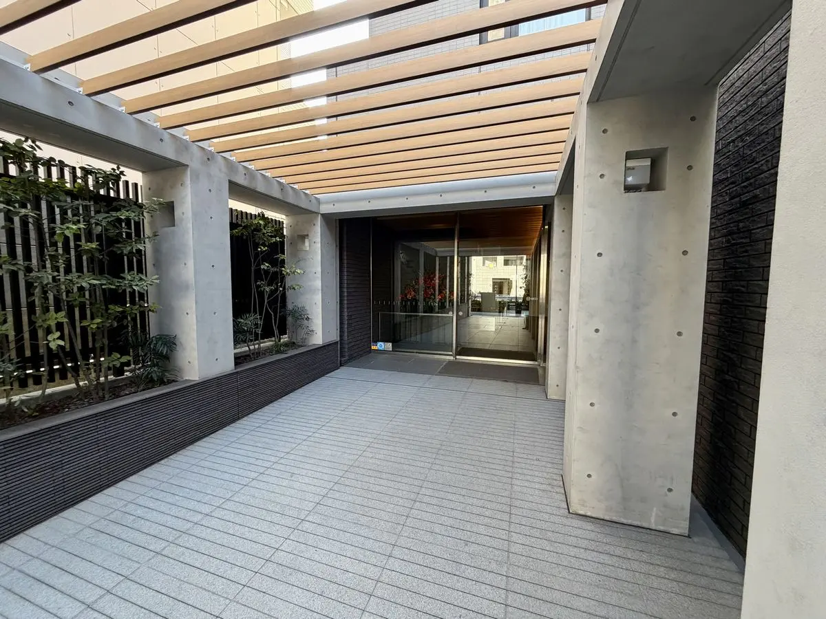 エントランスアプローチは木目のルーバーとコンクート打ちっばなしの列柱に誘われる優美なデザインで、その先のエントランスホールもアプローチと連続性のあるデザインになっています。