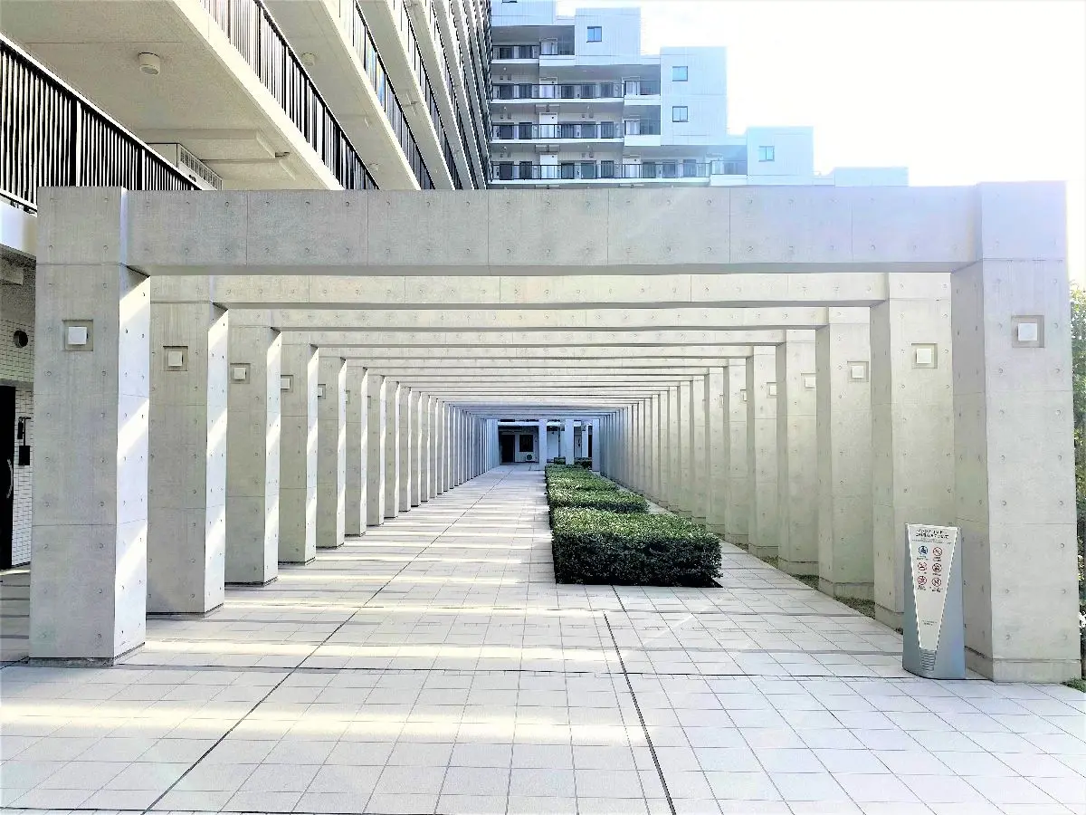 住戸棟までのアプローチ上には、列柱型の外廊下を配置。