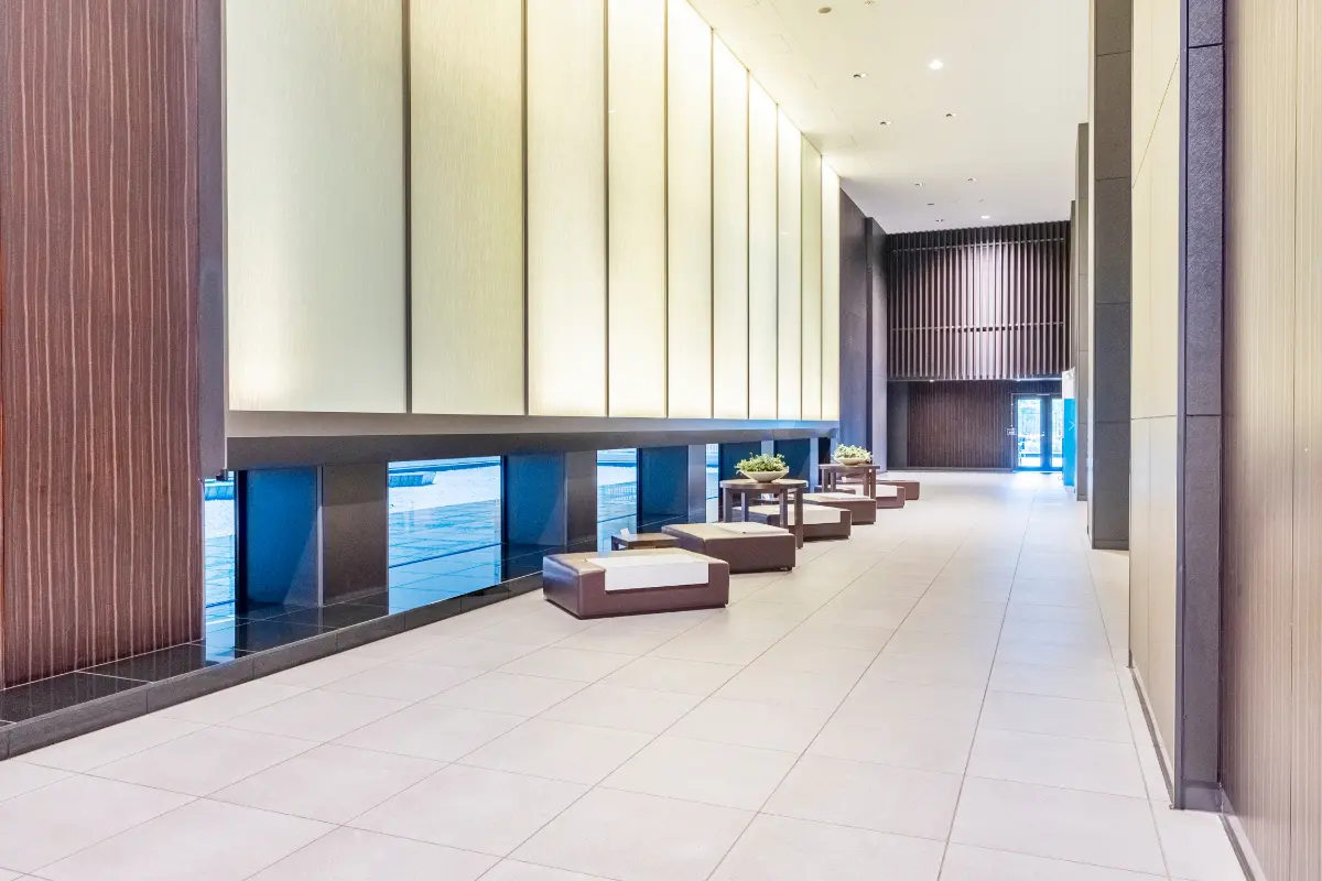 約230uのエントランスホールにコンシェルジュカウンターを設け、日々のこまごまとした取次、手配等、各種サービス(一部有償)を取り揃え、住まう方々をサポート。(タクシー配車サービス、クリーニング取次サービス、宅配便発送サービス等)