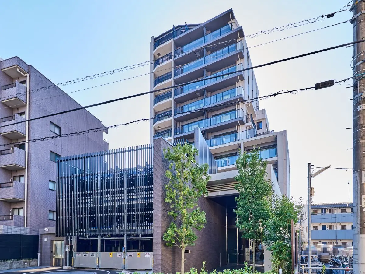 活気溢れる駅側と対象的にダークグレーとホワイトのスタイリッシュなデザインの外観になります。