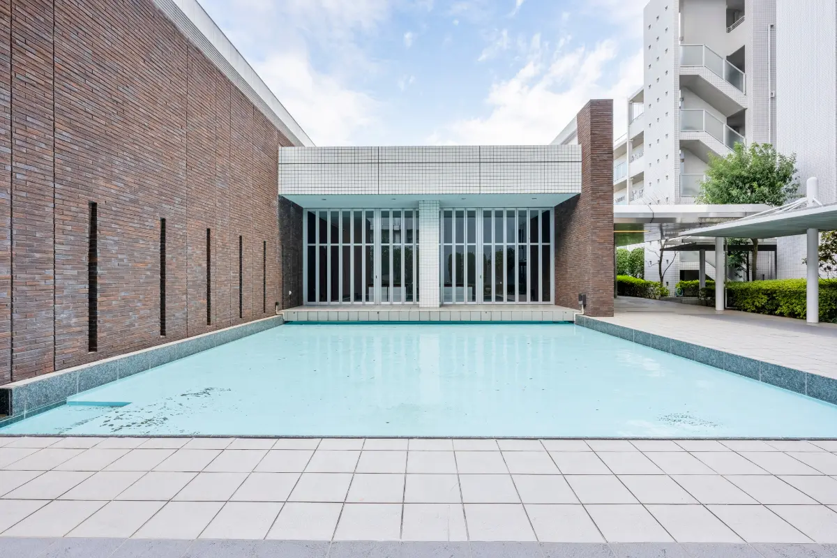 ・エントランスホールの先に設置された水盤があり、夜には水面下から華やかにライトアップされます