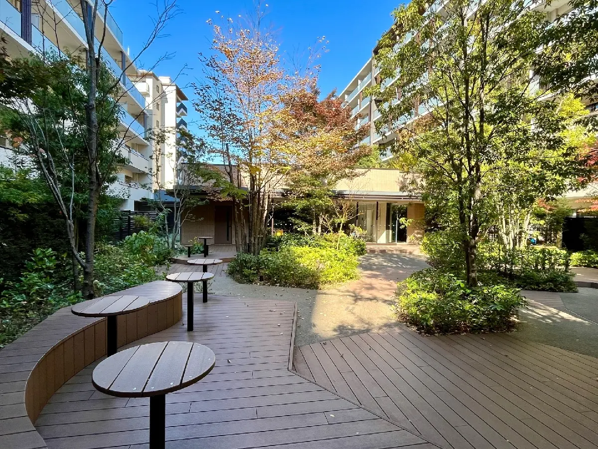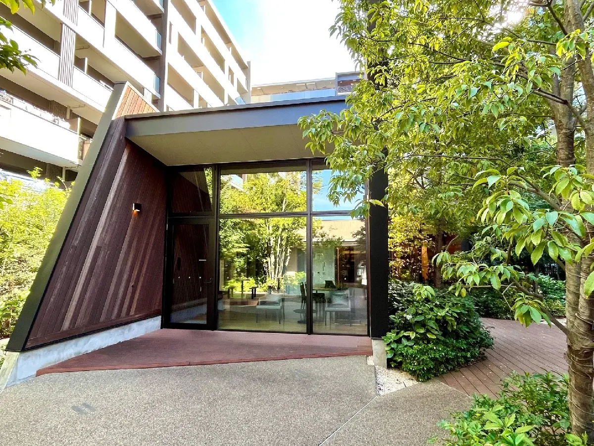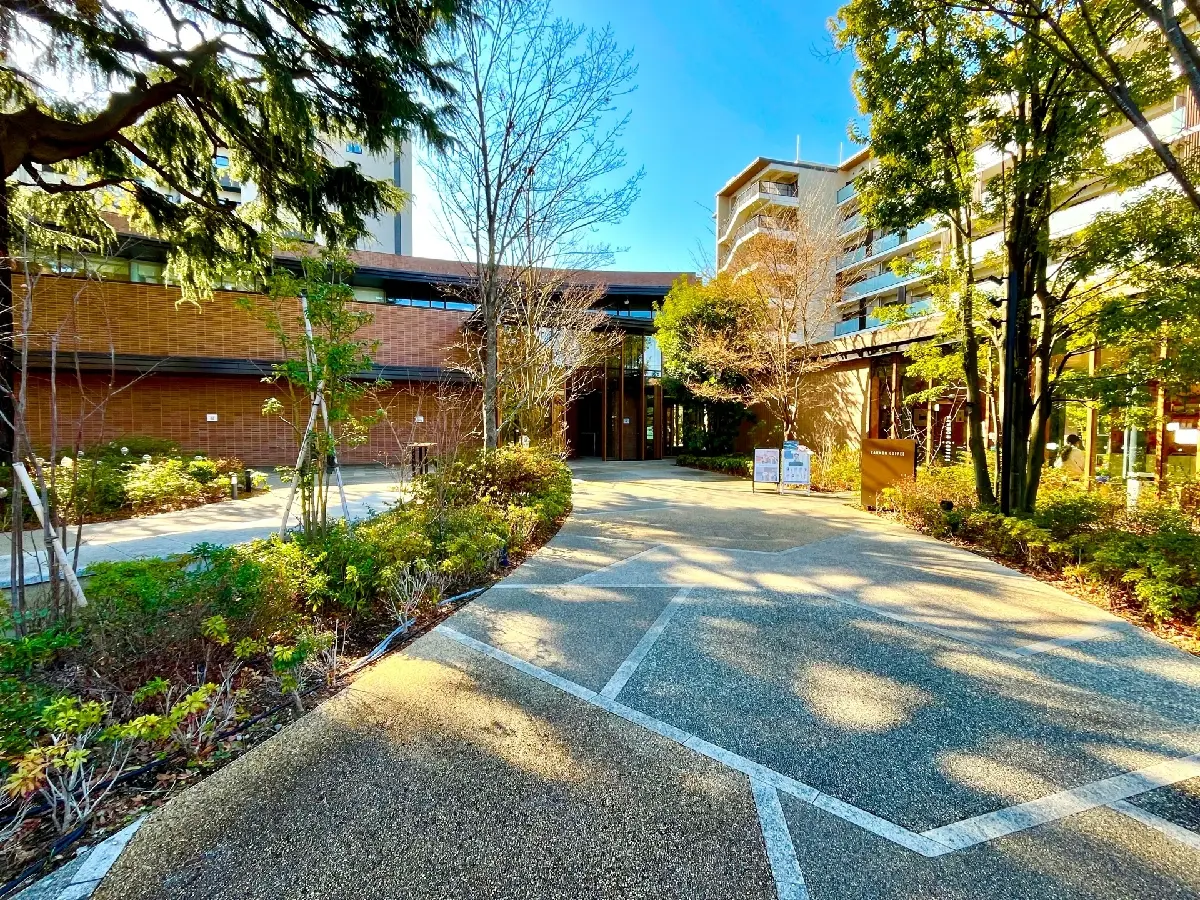 北側の前面道路沿いには樹齢約80年のヒマラヤスギの大木が2本そびえ立ち、長く地元の人々に愛された既存樹の2本の大木を残し、広い中庭に木造の共用棟を設けるなど、敷地全体に木と緑が感じられるマンションとなっております。