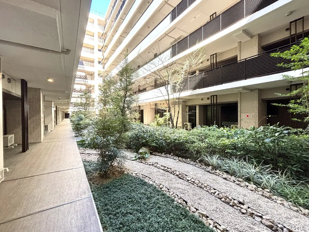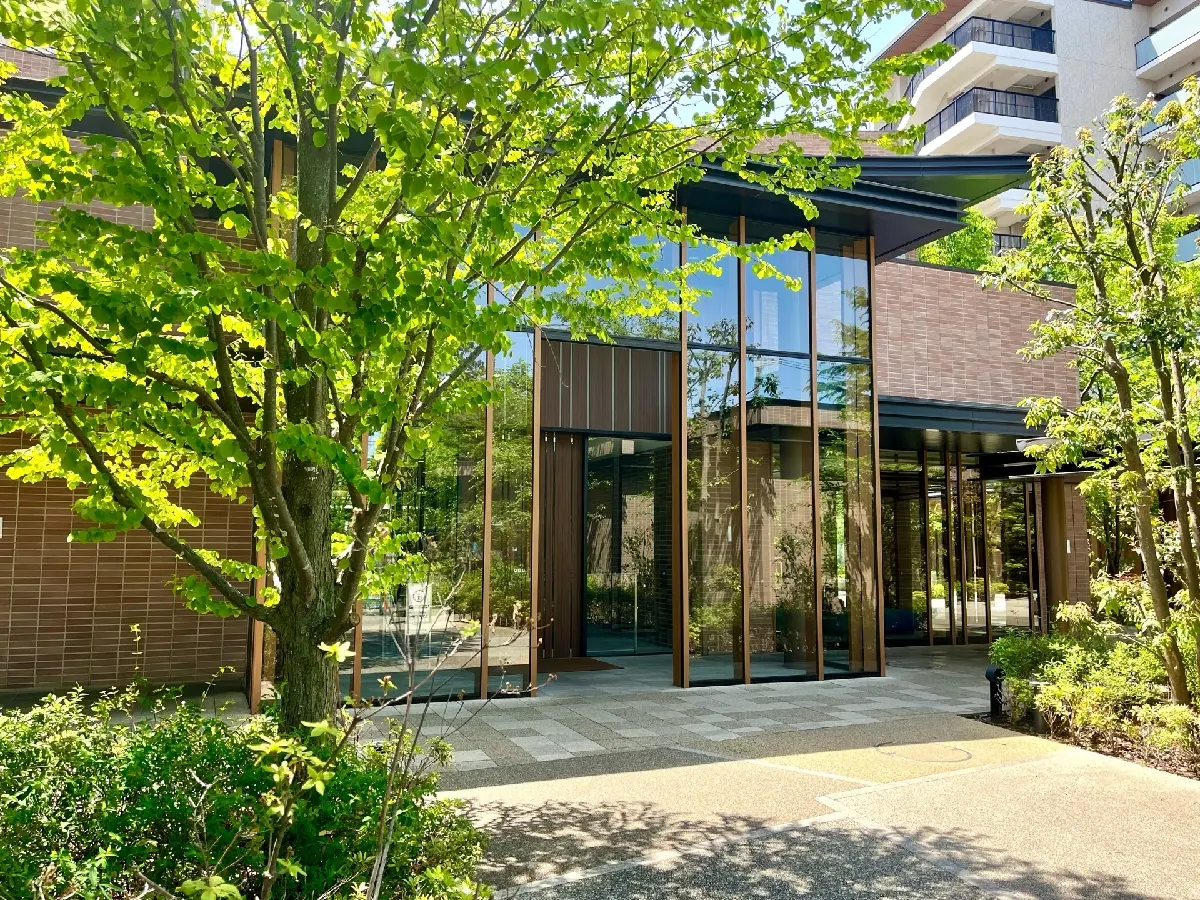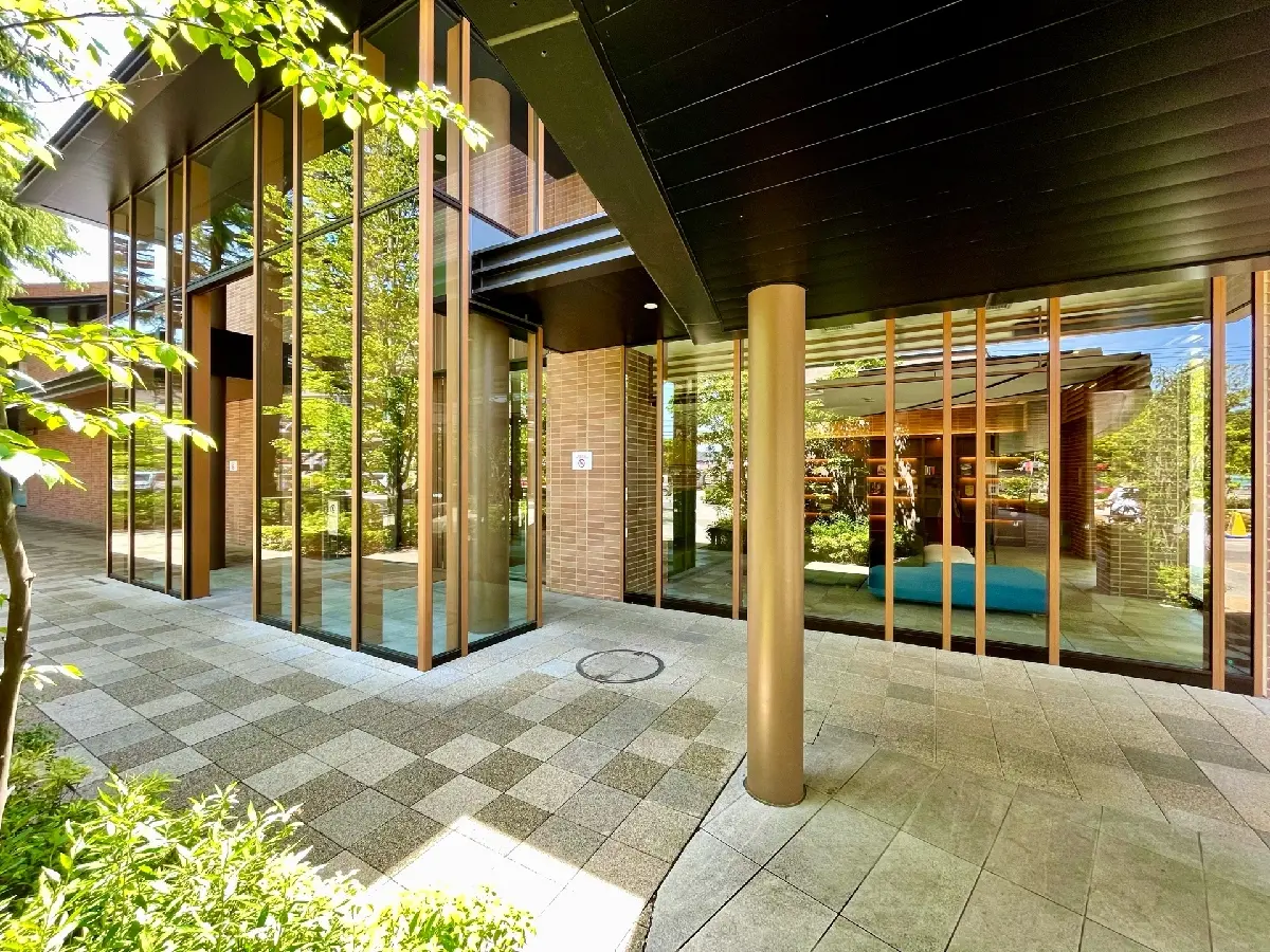 北側の前面道路沿いには樹齢約80年のヒマラヤスギの大木が2本そびえ立ち、長く地元の人々に愛された既存樹の2本の大木を残し、広い中庭に木造の共用棟を設けるなど、敷地全体に木と緑が感じられるマンションとなっております。