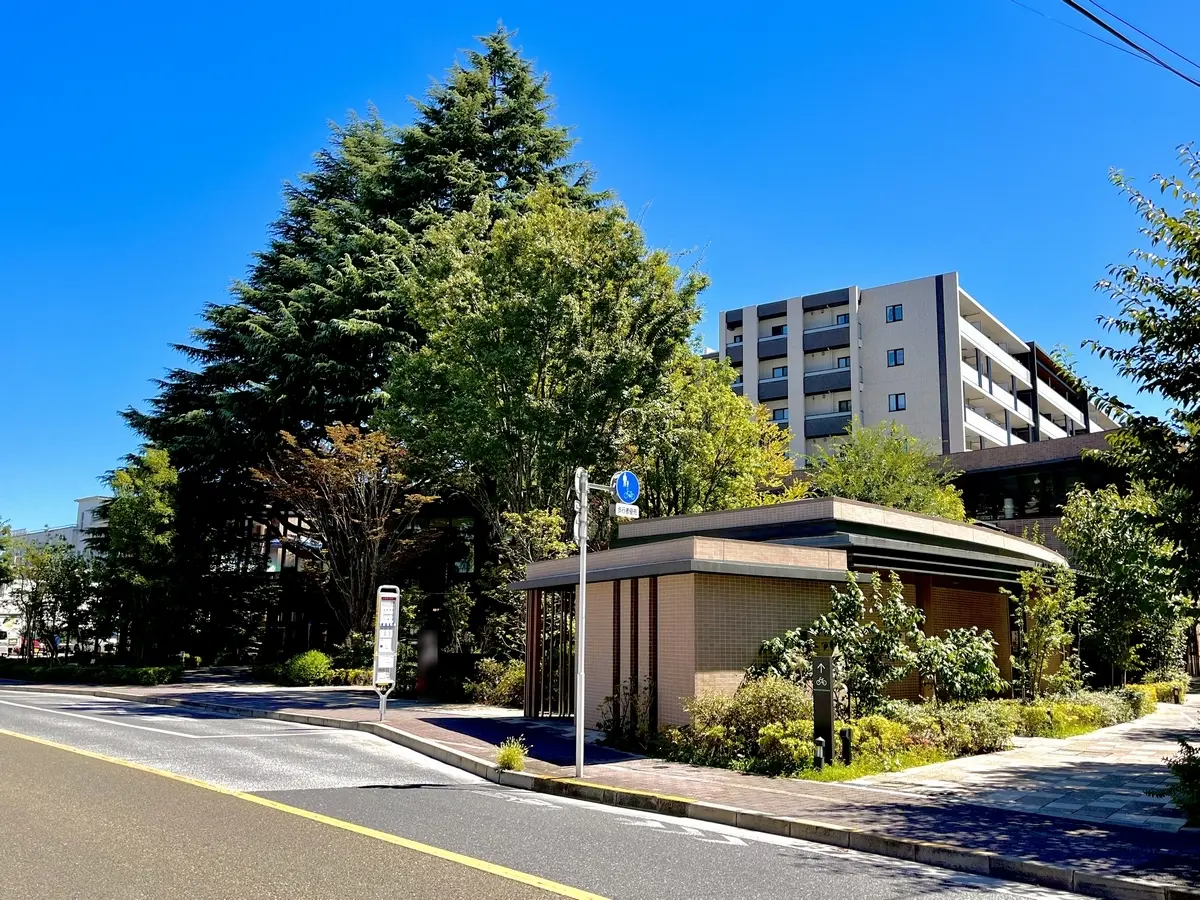 目の前のバス停近くには屋根付きのバス待合所があり、マンションのエントランスからはカフェの裏手に設けた回廊を経由して、雨の日も濡れずにバス停まで至ることができます。