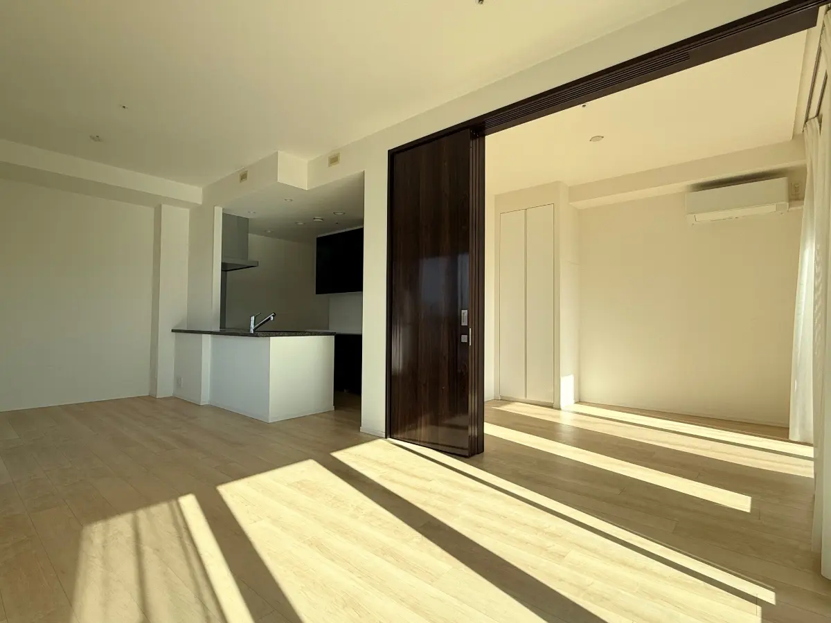 33階建て15階部分の南・西向き角住戸であり、日照時間が長いため、リビングダイニングは明るく開放的な印象を与えます。洋室(約6.0帖)にはウォークインクローゼットを備えており、廊下収納やシューズインクローゼットなど収納豊富な間取りになります。