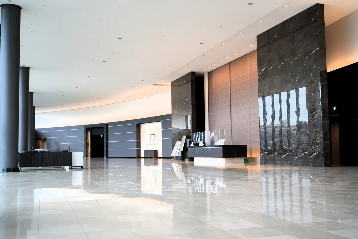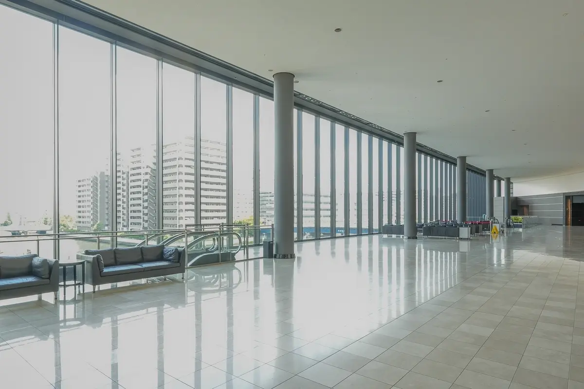 □高さ約6.5mを誇るグランドロビーより豊洲運河を望む