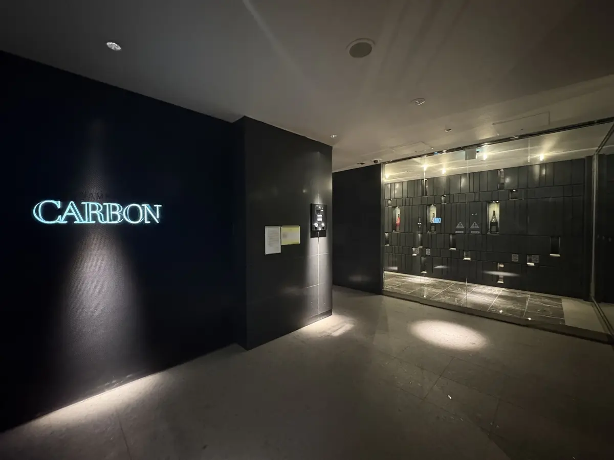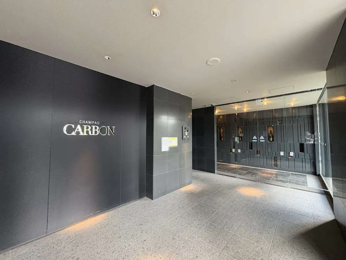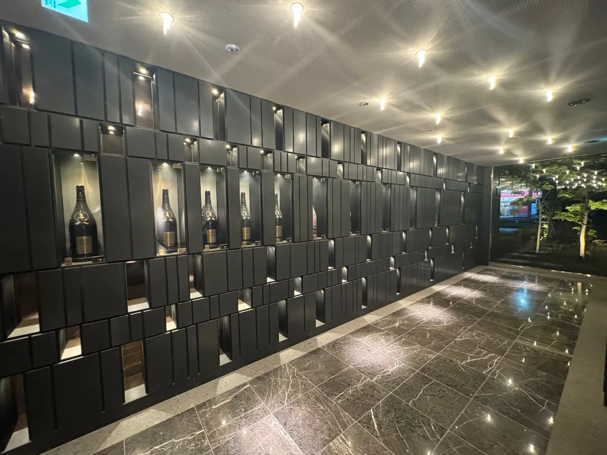 スタイリッシュながらも上質感漂うエントランスを抜けると、エントランスホールには「シャンパーニュカーボン」のF1開催国・21会場の特別記念マグナムボトル全21本をミニギャラリーにて展示。煌めく存在感で非日常感を演出します。