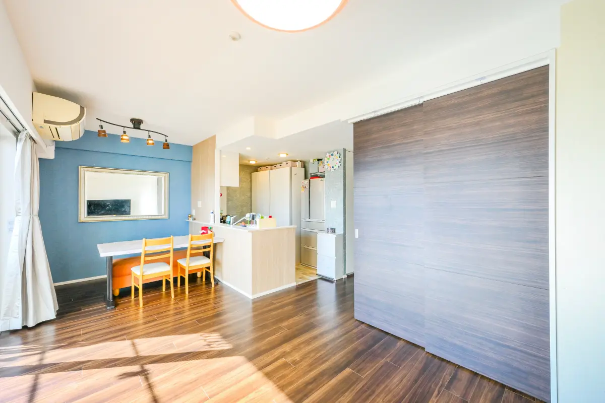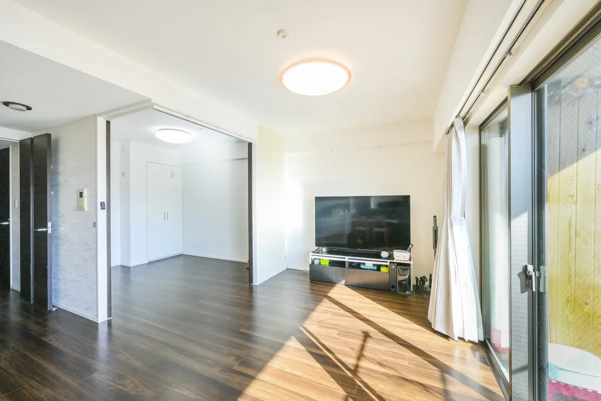 リビングダイニングは、中央から両サイドに向けて開く、広い間口のセンターオープンサッシ。8階南向きの日差しと眺望を享受する空間が、ご家族のくつろぎの時間を優しく包みます。