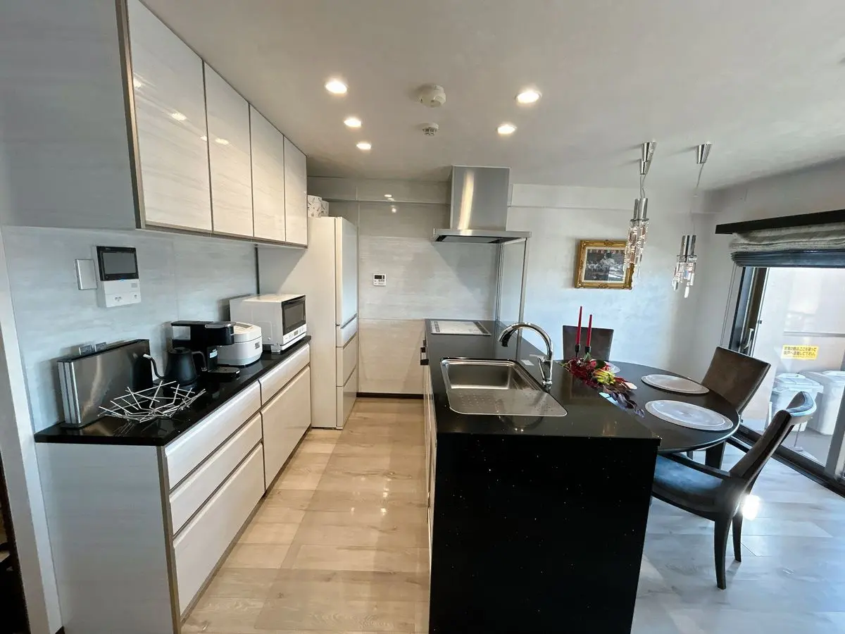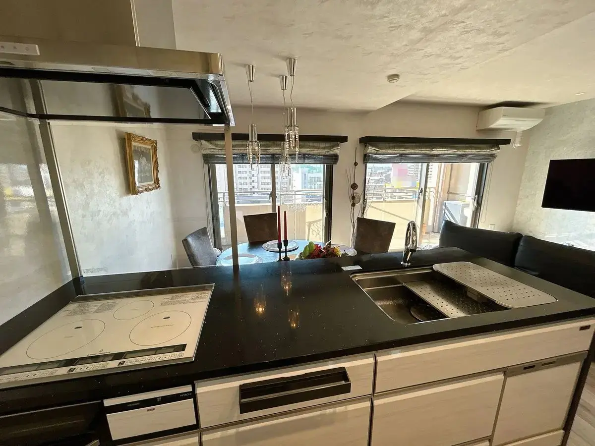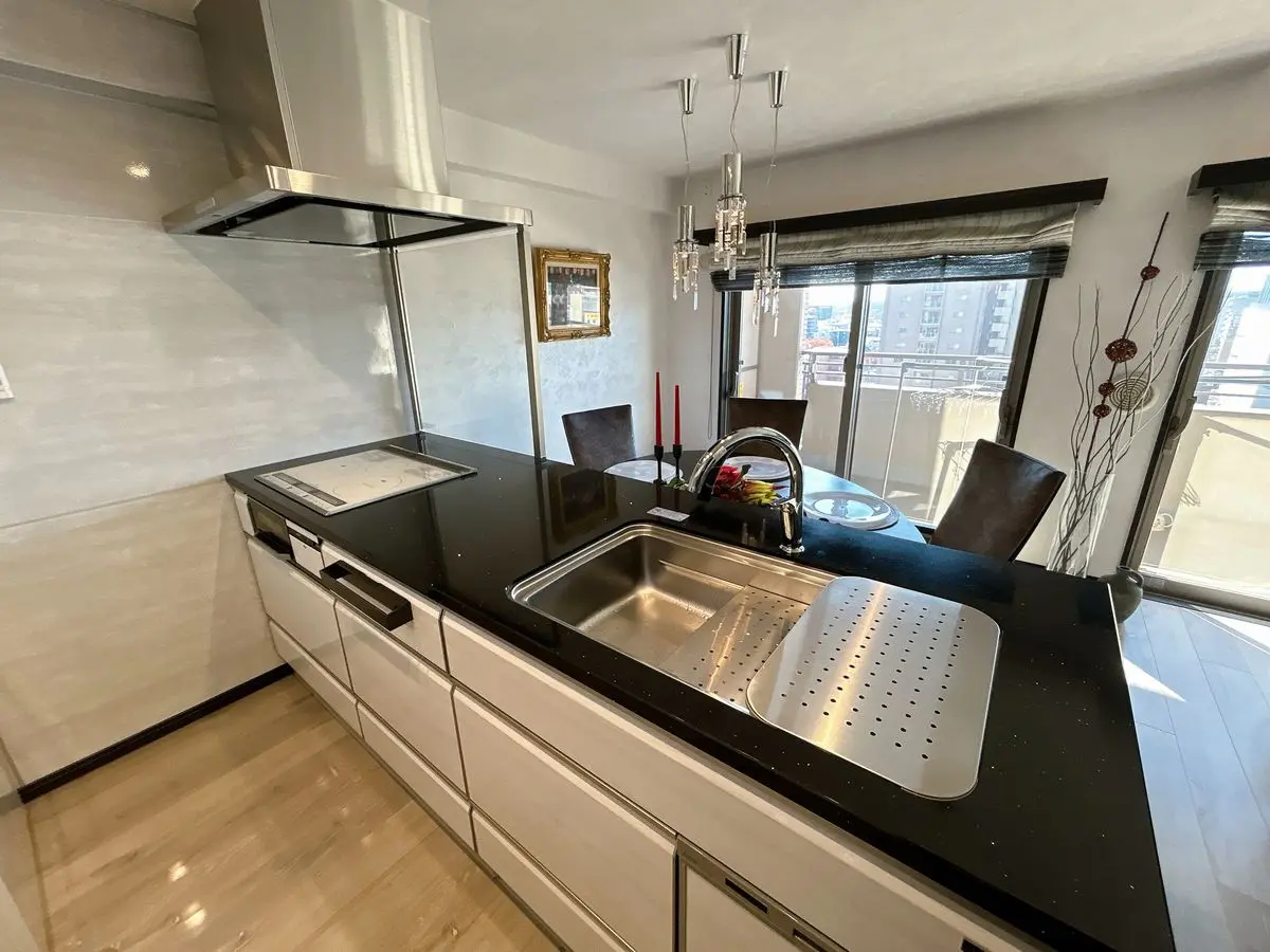 開放的なオープンキッチンは、リビング全体が見渡せ、壁面は天然の大理石タイル貼りとなります。