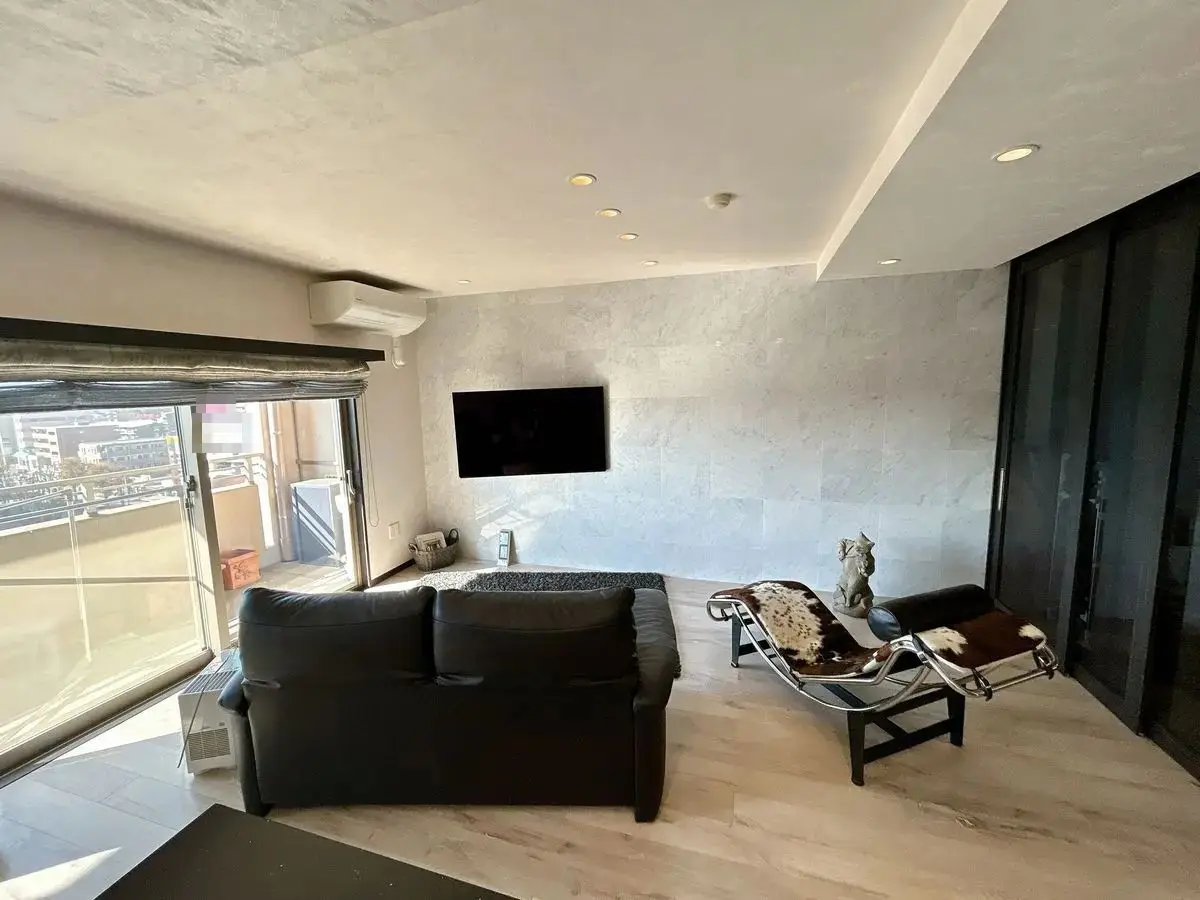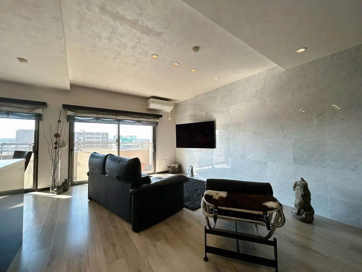 ・リビングダイニングの壁面は天然大理石タイル貼