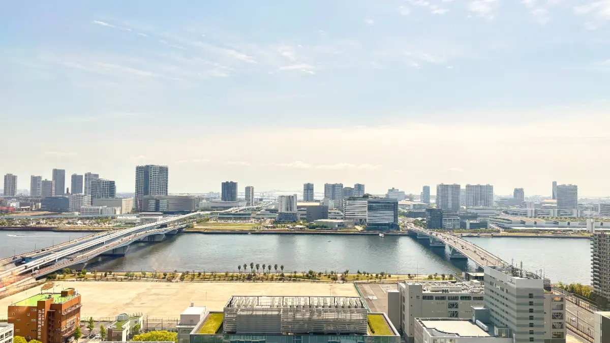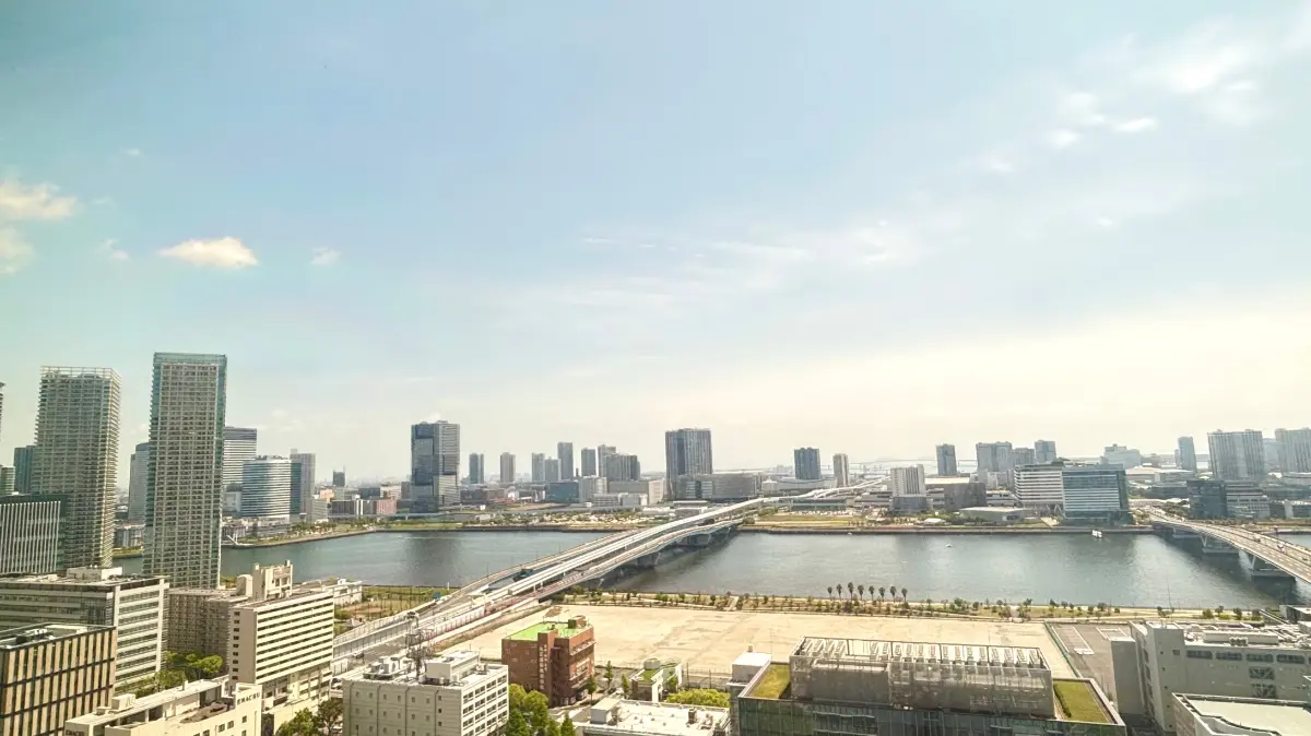 地上約180mのツインタワーはガラスを纏い、湾岸のランドマークとしての存在感を放ちます。