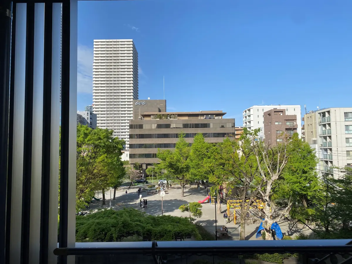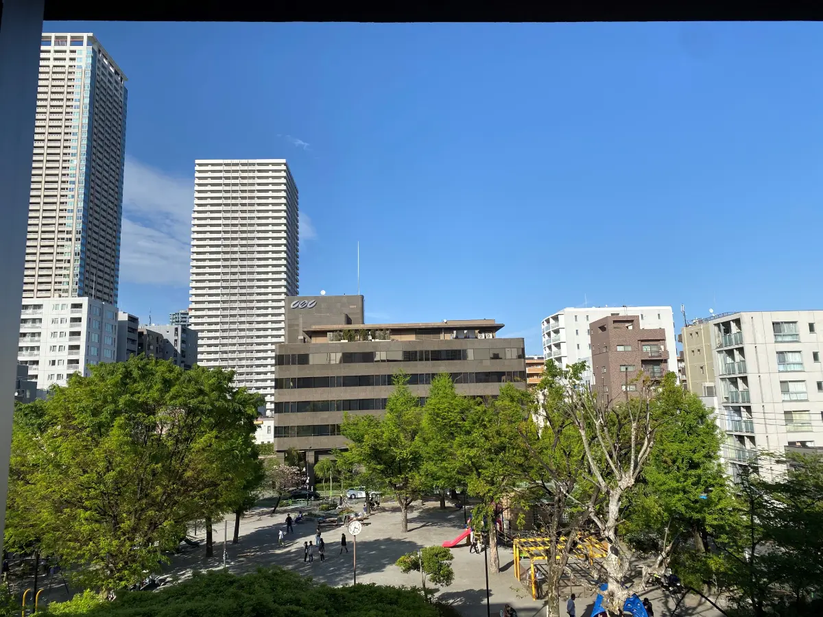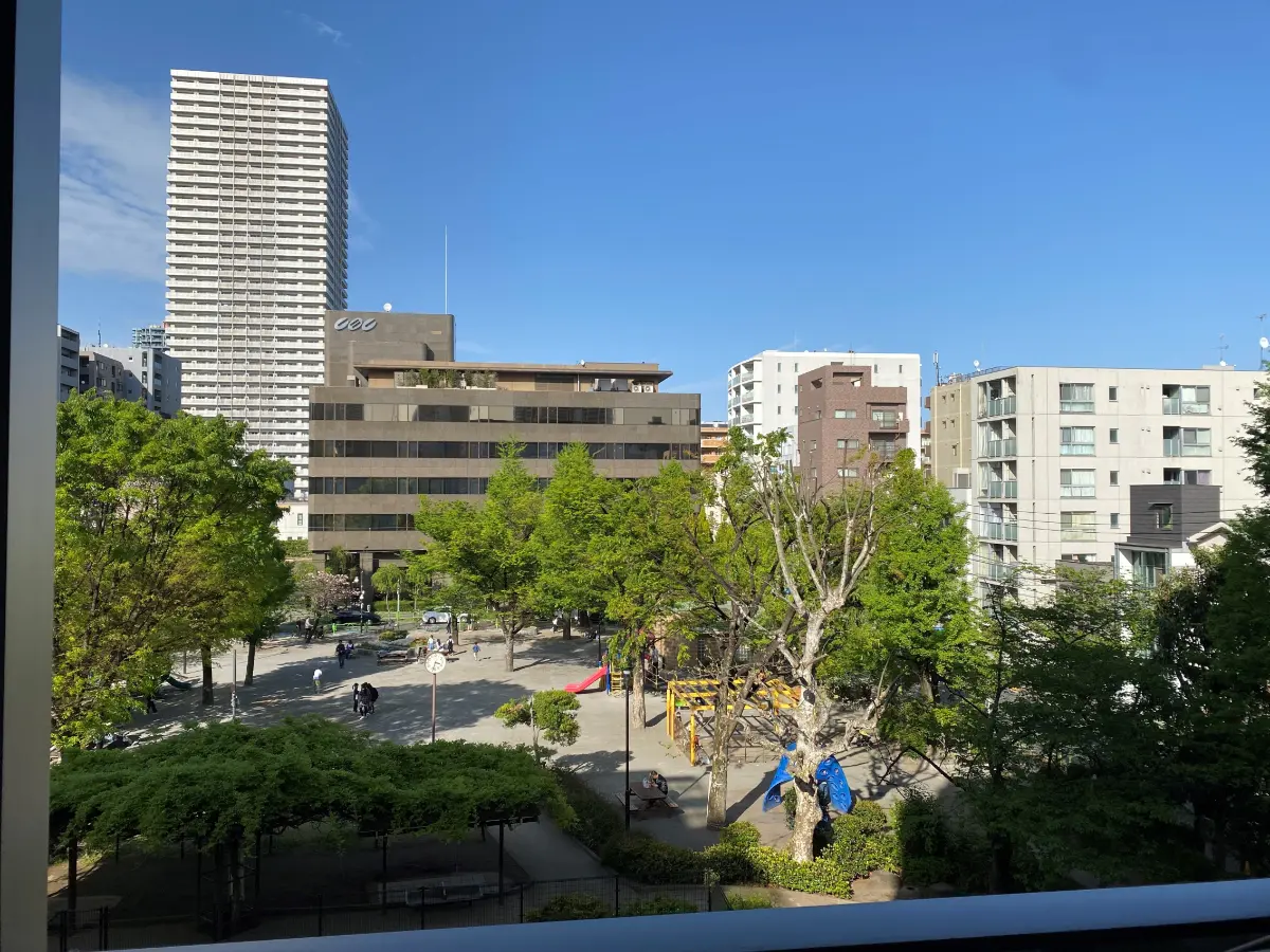 お部屋は4階部分・北東向き、月島第一児童公園を望む眺望です。