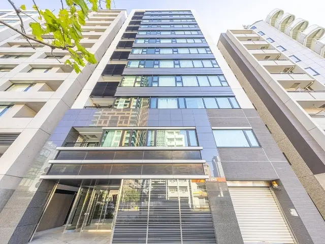 シティハウス月島駅前エアーズコートは2010年3月竣工、住友不動産旧分譲、総戸数54戸の12階建てマンションです。白を基調に黒のアクセントが入りガラスをふんだんに使った建物外観です。