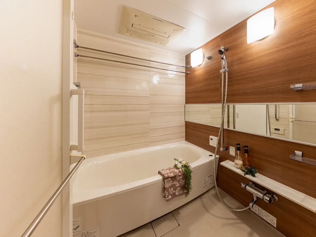 LDKは約16.4帖、浴室には1418サイズのバスタブが備わっており、トイレには上部吊戸棚が設置されております。
