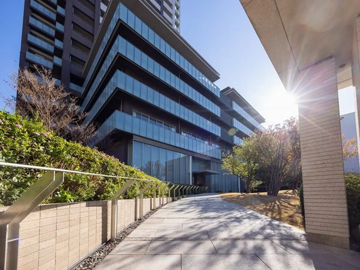 マンションの低層部は、アースカラー調のタイルにより緑との調和をはかり、基壇壁面のガラスウォールには緑豊かなランドスケープや街並みが映り込みます。