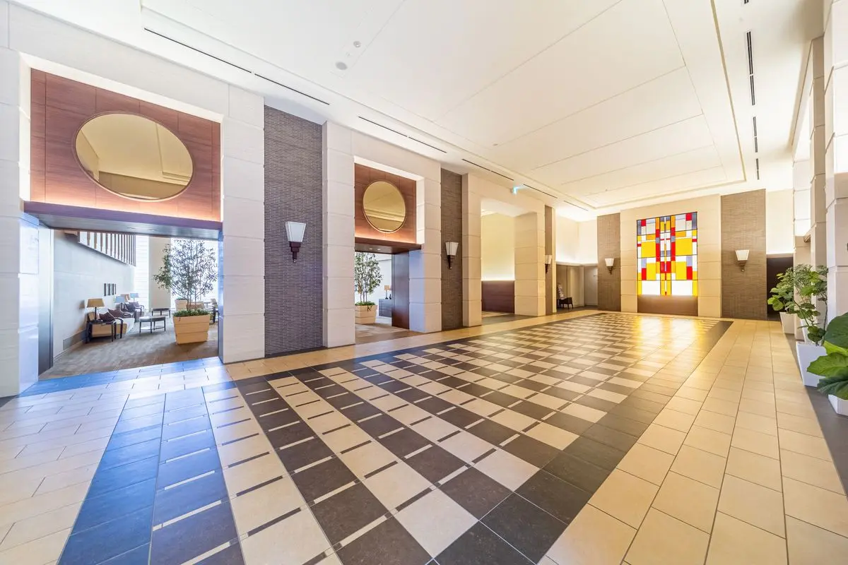 1階部分にはモニター付きオートロック、天井高約5.6mの重厚感あるメインエントランスがございます。御影駅前と国道2号線を結ぶグリーンプロムナードからアプローチするサブエントランスは、約8mの吹抜けとなっています。