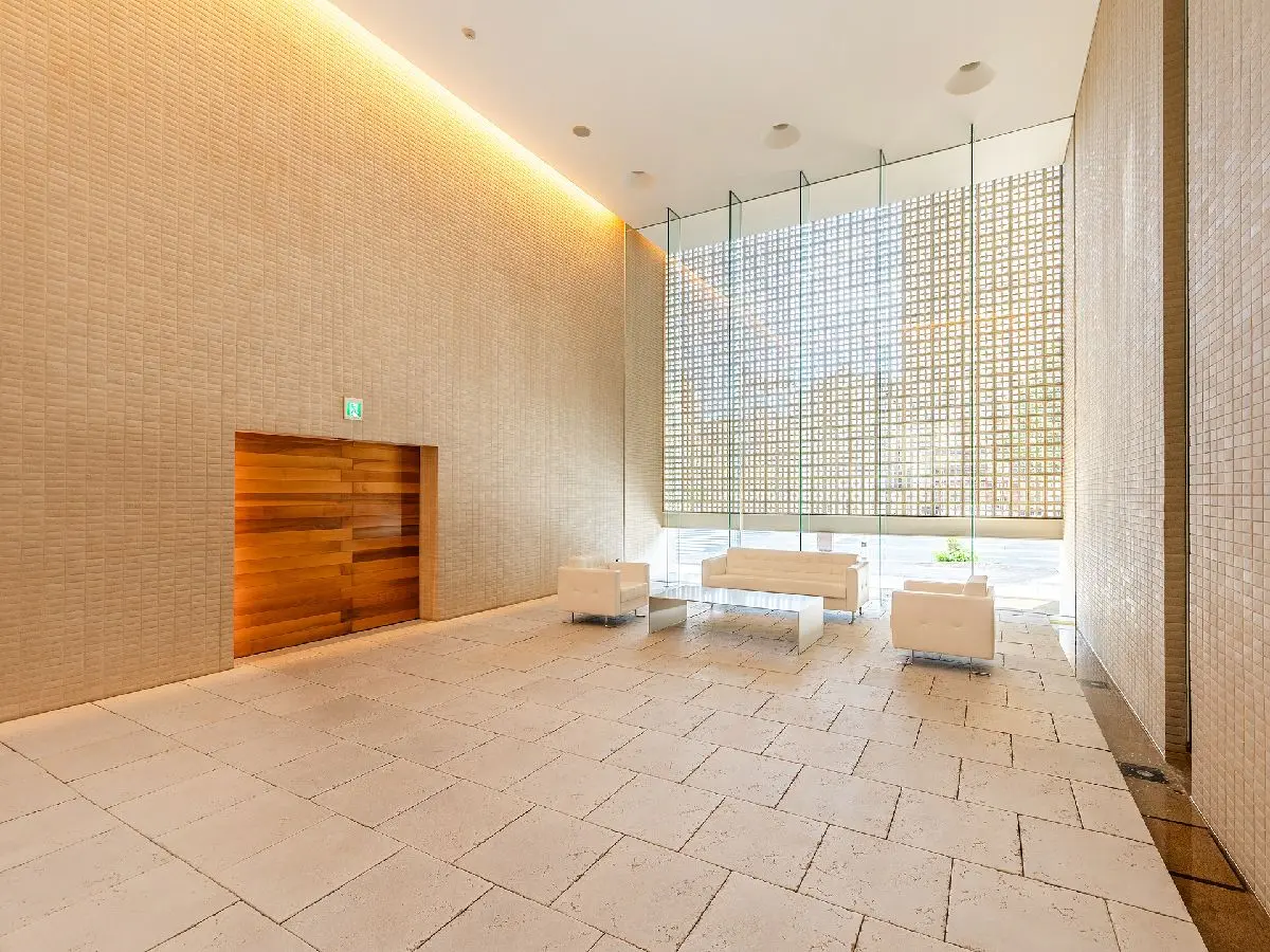 エントランスホールは、奥行きのある陰影を創り出しながら透過する自然光を招き入れる広間となっており、光は壁に反射し、流れ落ちる水と相まって幻想的な光の粒子で充たされます。
