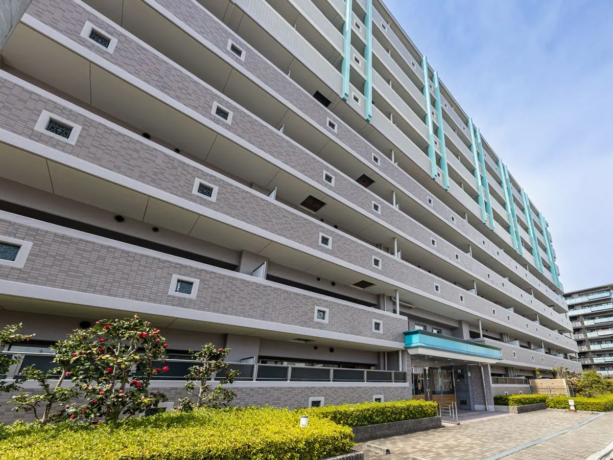 マンション外観の特徴として、建物の中層部から伸びるグリーンのマリオンが描く縦のラインと、シックなカラーのバルコニーが形づくる横のラインが建物のファサードにリズミカルなコントラストを演出しています。