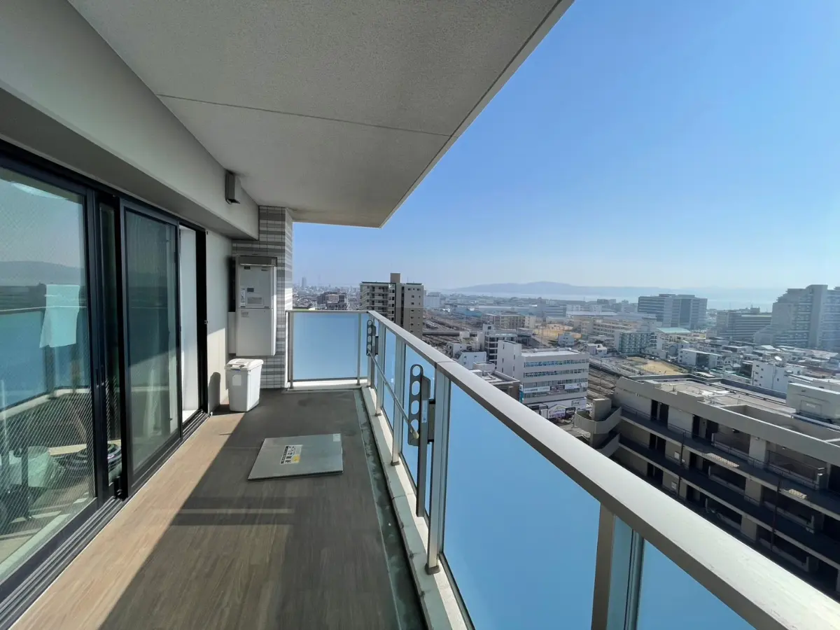 お部屋は、15階建ての最上階、専有面積82.29u、間取り2LDKとなっており、バルコニーからは明石海峡大橋を望むブリッジビューをお楽しみ頂けます。(天候による)