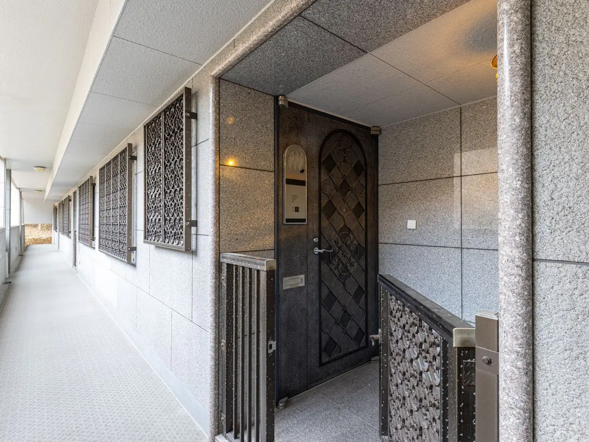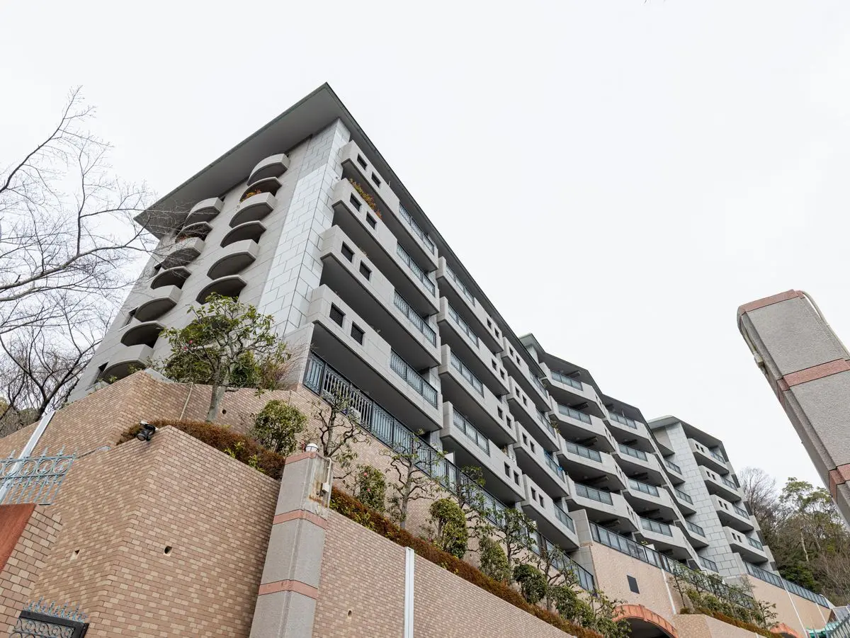 こちらは奥山にある株式会社すまい旧分譲、総戸数38戸のマンションです。標高約160mの高台にあり、駅までは坂道ですが、周囲は六甲山系の緑に囲まれ、すぐ西側を芦屋川が流れる自然豊かな住環境です。建物は7階建で、全戸陽当りの良い南向き。外壁は石調のタイル張り、敷地入口にはアーチがあり、エントランスには不審者の侵入を未然に防ぐオートロックが設置されています。