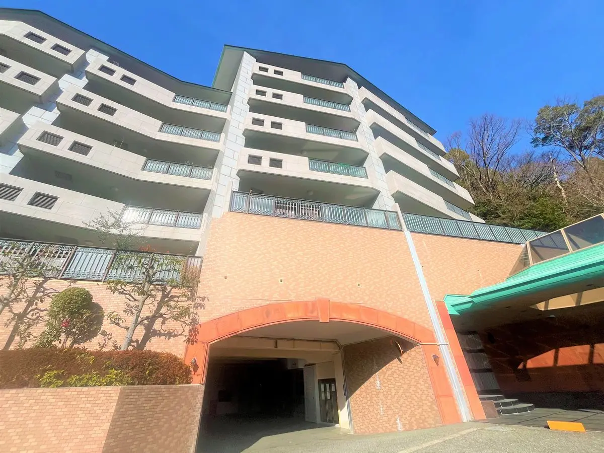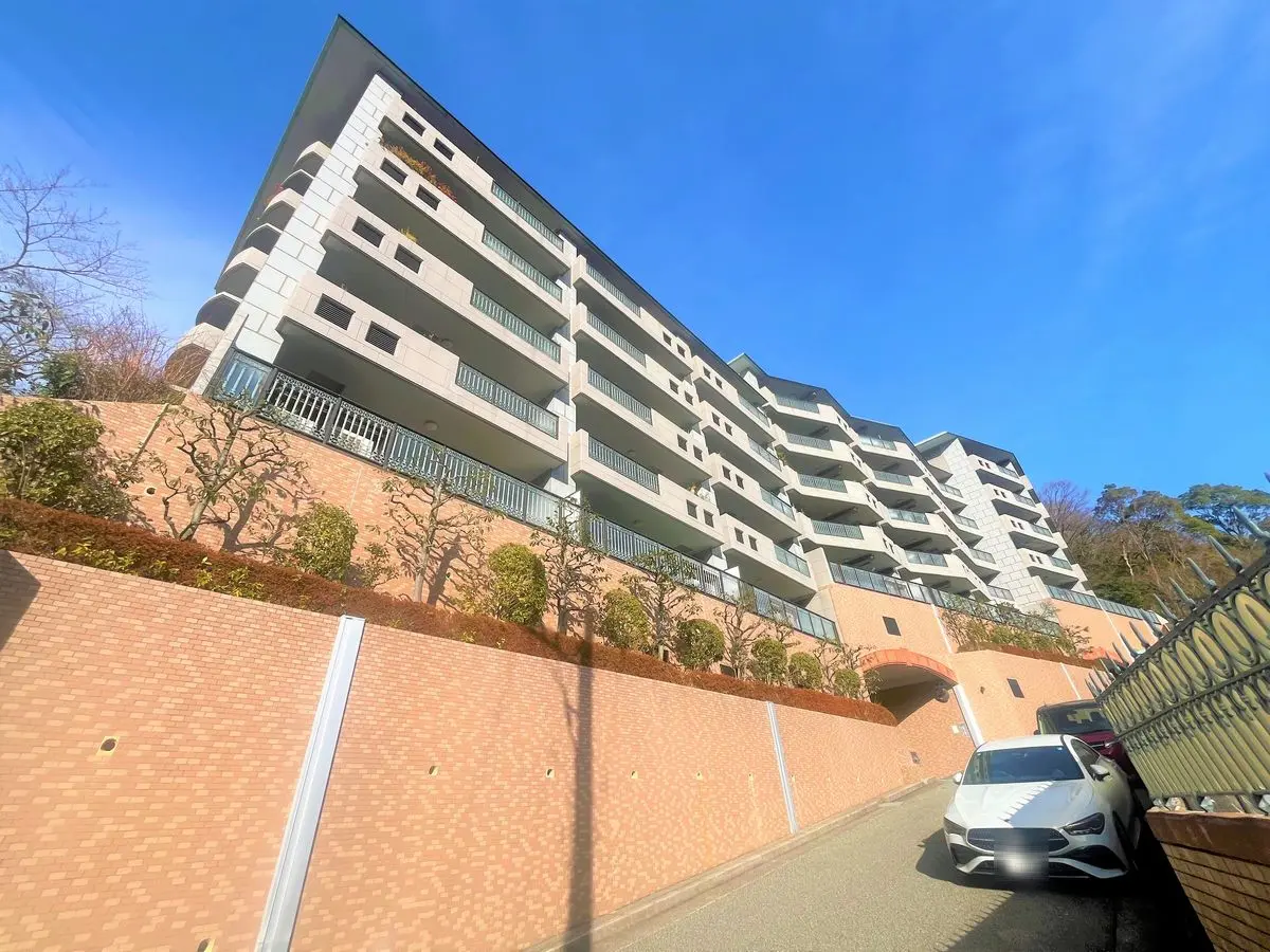 こちらは奥山にある株式会社すまい旧分譲、総戸数38戸のマンションです。標高約160mの高台にあり、駅からは坂道を上がりますが、周囲は六甲山系の緑に囲まれ、すぐ西側を芦屋川が流れる自然豊かな住環境です。建物は7階建で、全戸陽当りの良い南向き。外壁は石調のタイル張り、敷地入口にはアーチがあり、エントランスには不審者の侵入を未然に防ぐオートロックが設置されています。