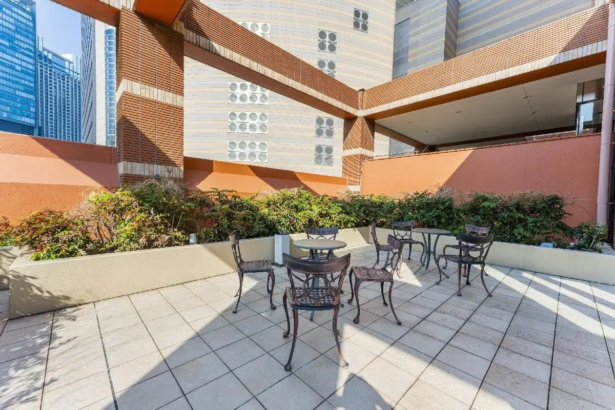 「なんばパークス」屋上庭園と屋根付デッキで直結しています。