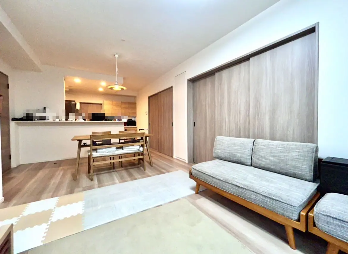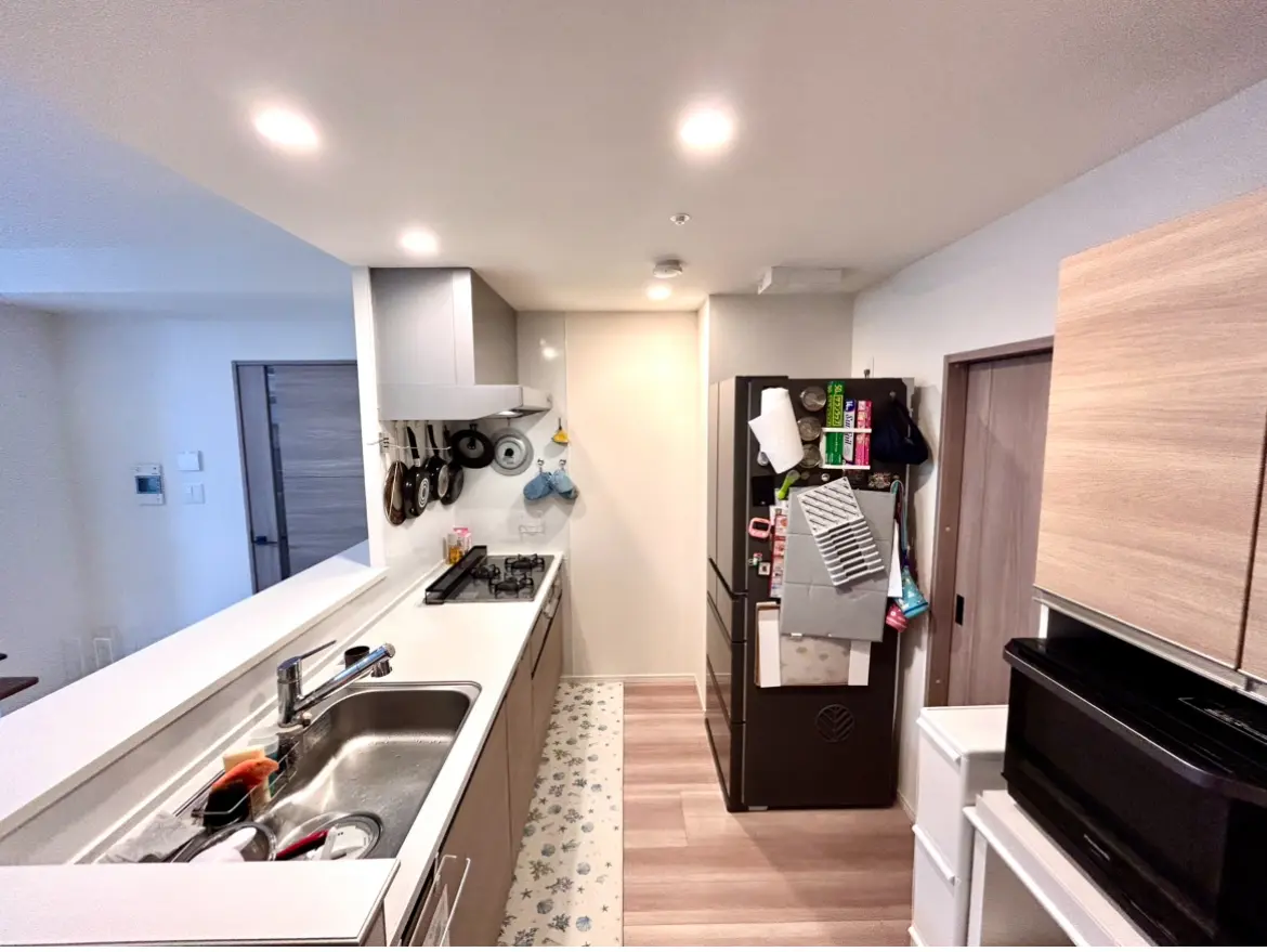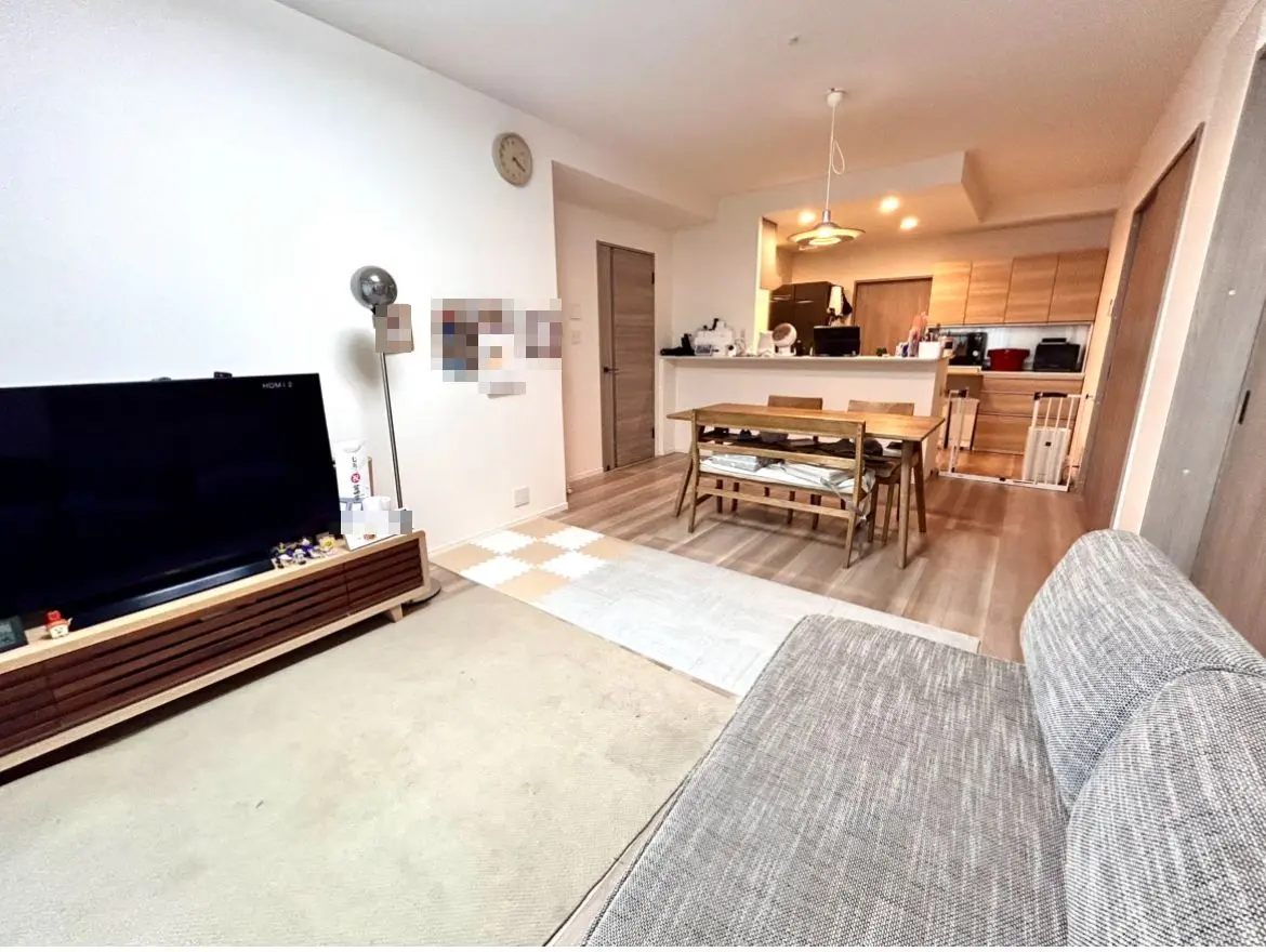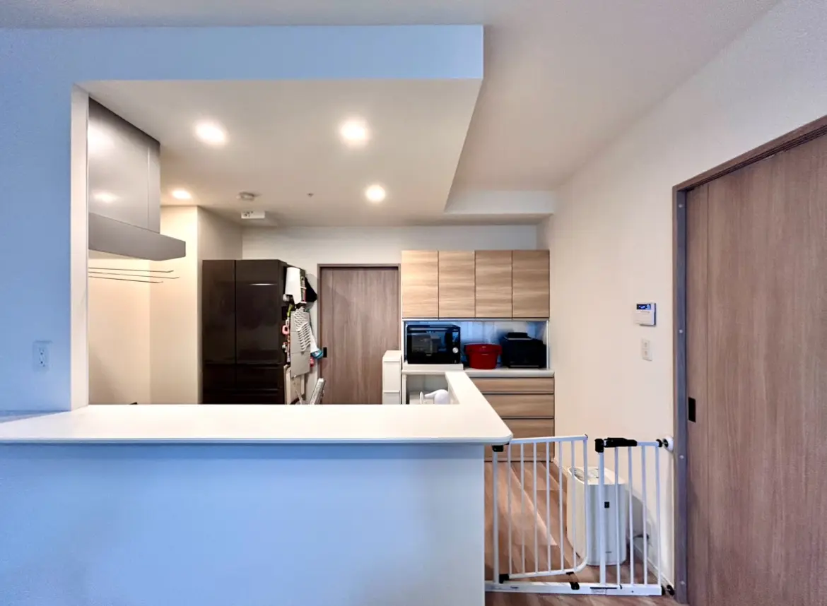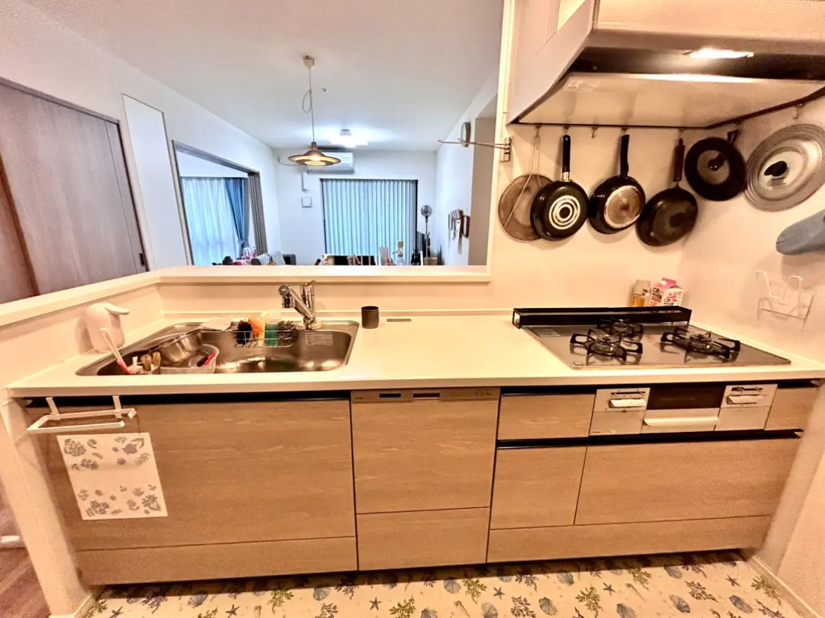 対象のお部屋は、3LDKの77.29uからなり、カウンターキッチンのためリビングの様子を見ながら家族団らんのお時間を過ごすことができます。