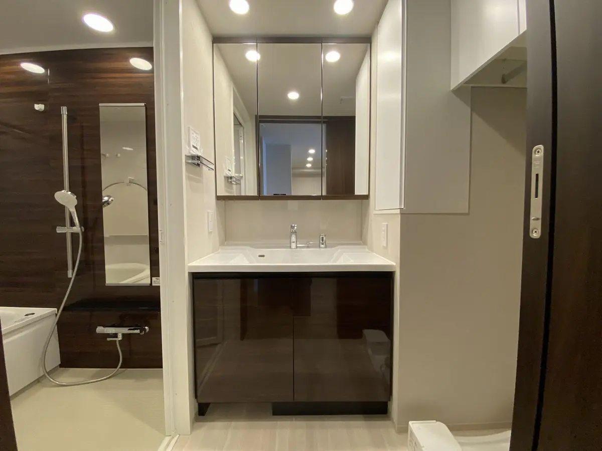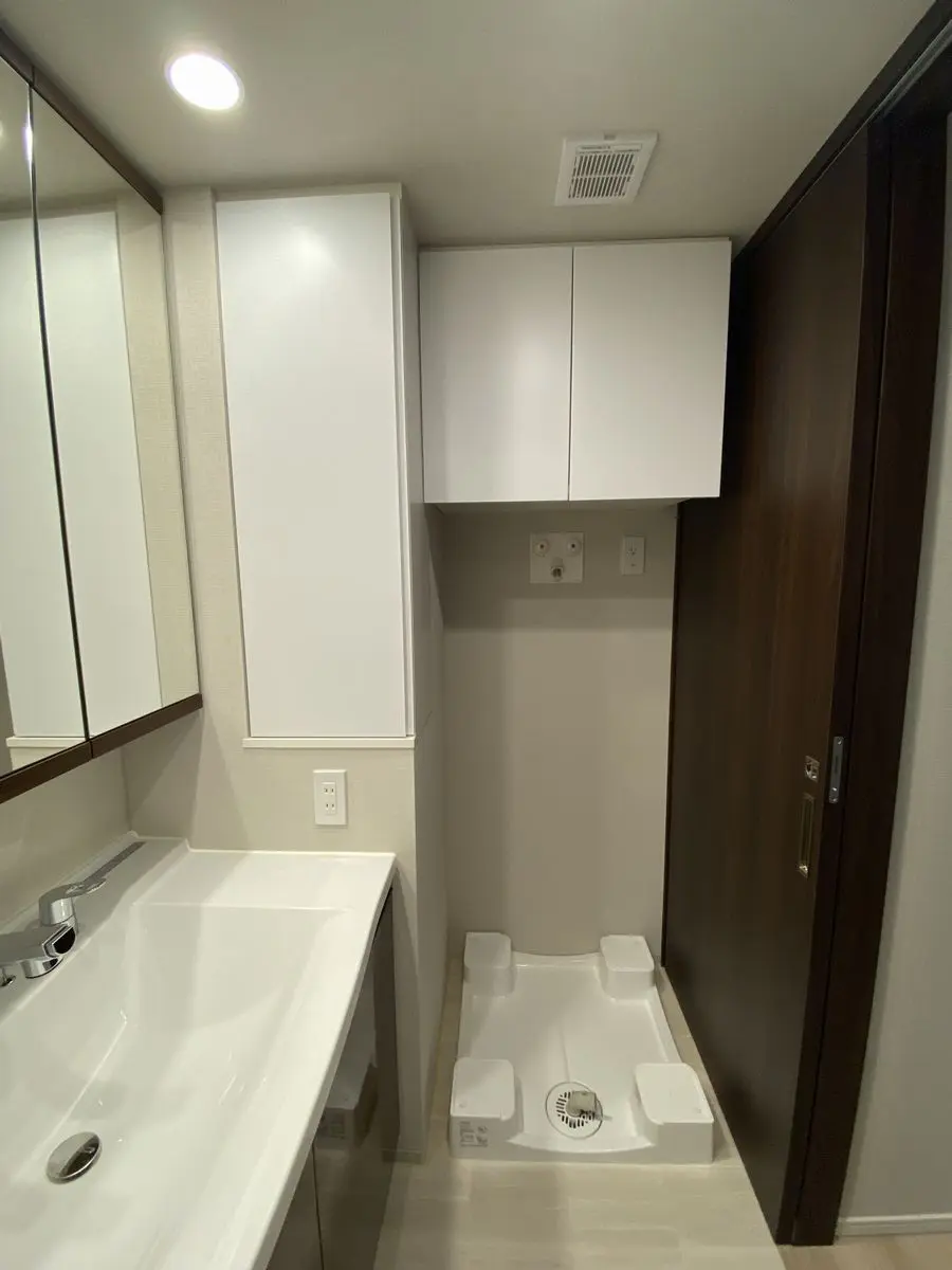 ◇洗面化粧台に人造大理石カウンタートップ・ボウル一体型カウンター・三面鏡収納付き