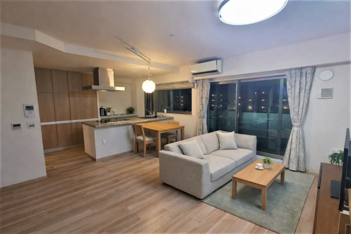 洗練された雰囲気のキッチン一体型LDK。リビングと自然につながるペニンシュラ型キッチンにより、