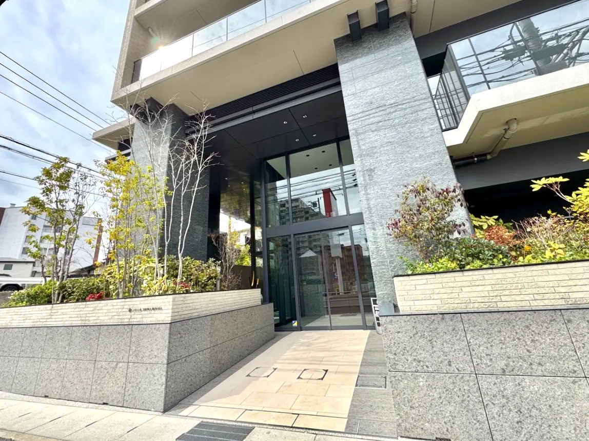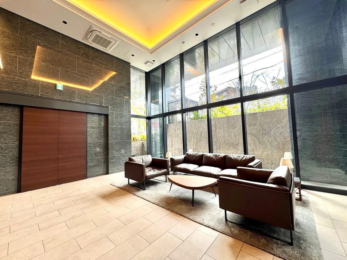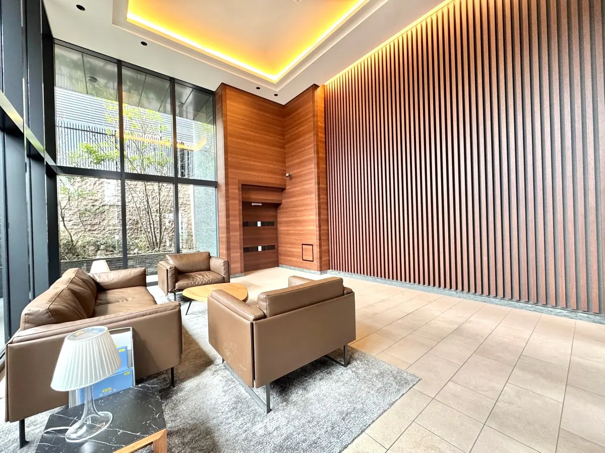 優しいベージュのタイル貼りに花崗岩やバルコニーのガラスパネルがアクセントのスタイリッシュな外観、天井高約5.0mの2層吹抜けの高級感あふれるエントランスラウンジからは、敷地内の植栽が望めます。
