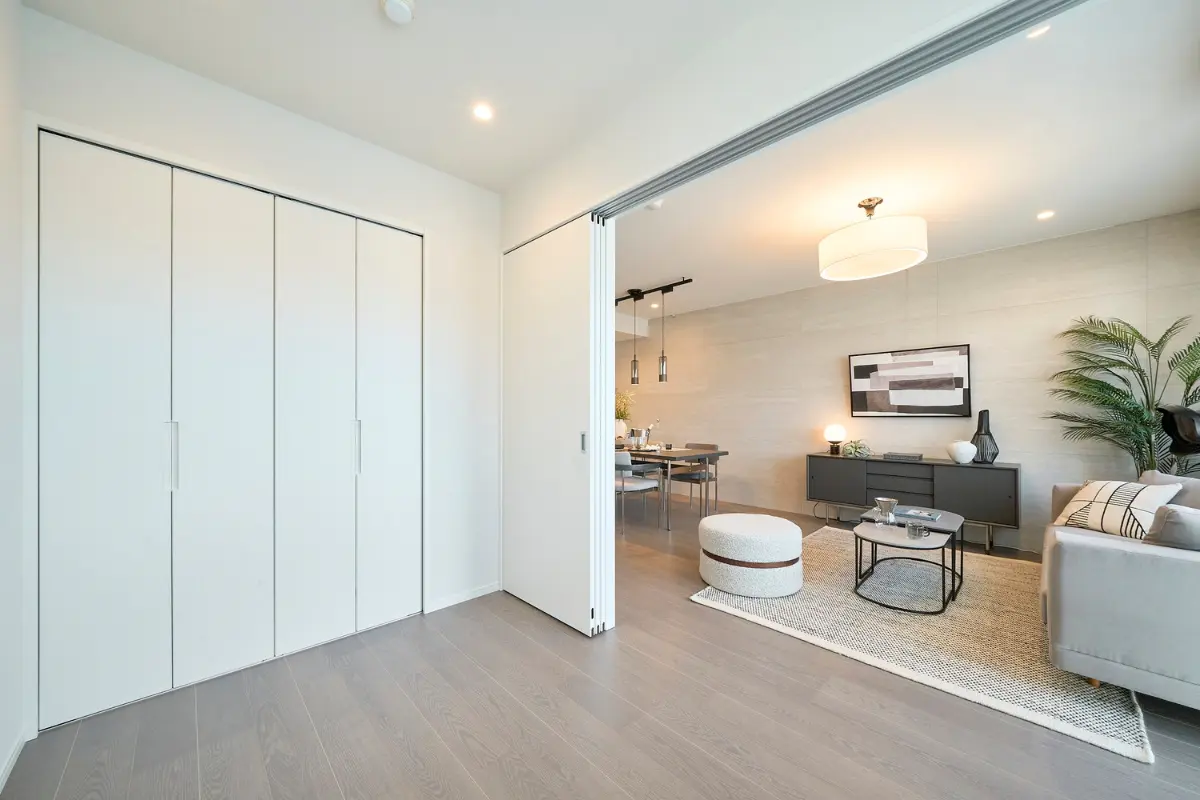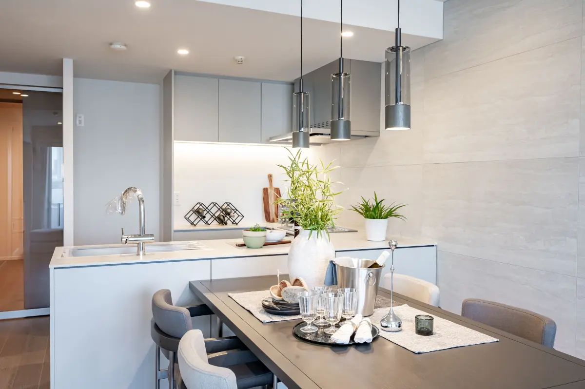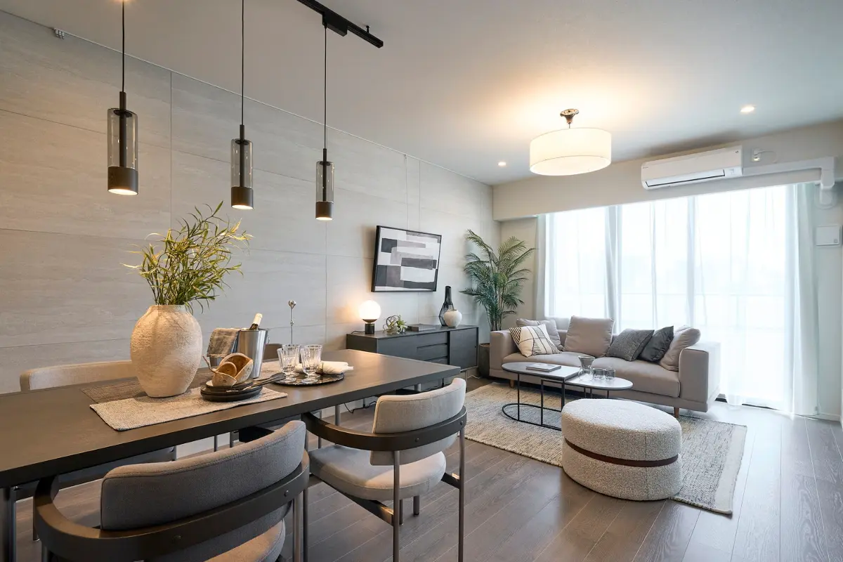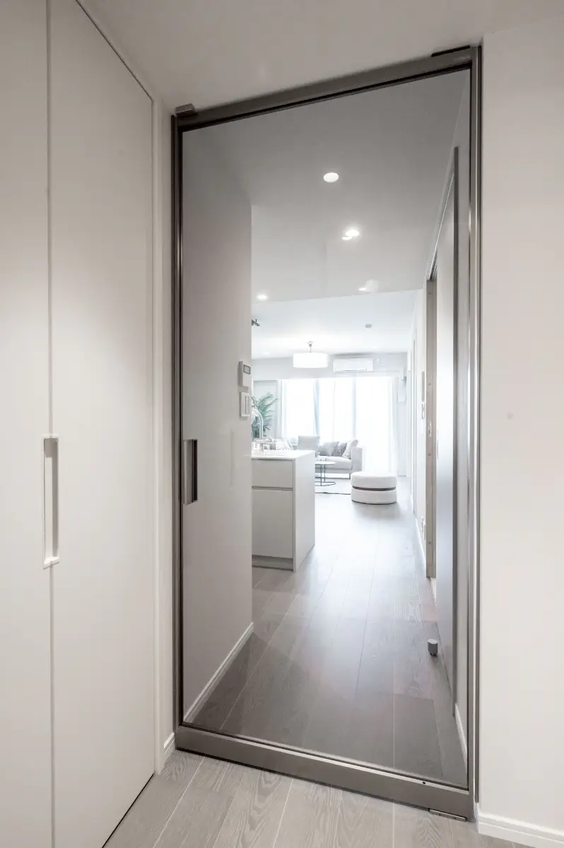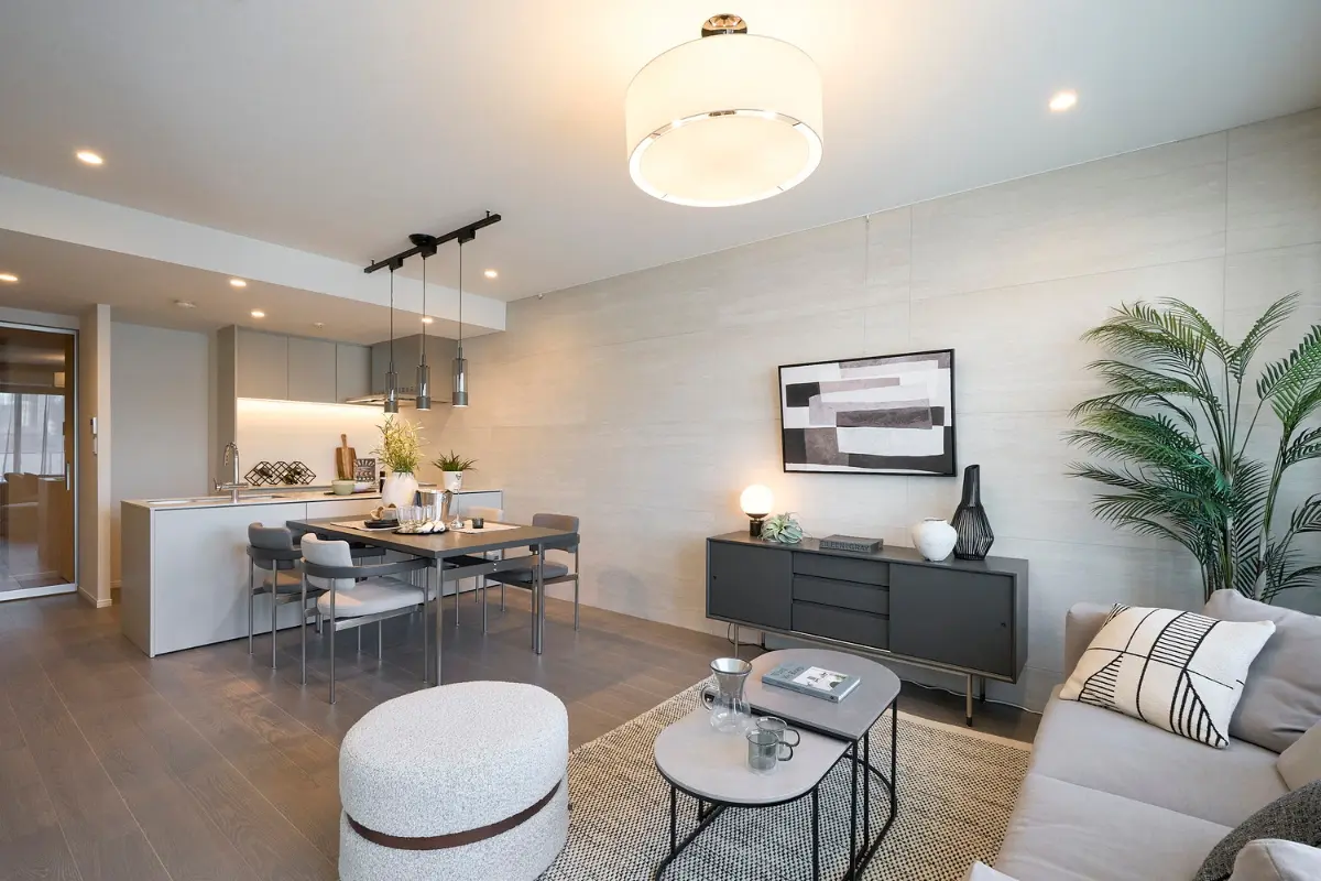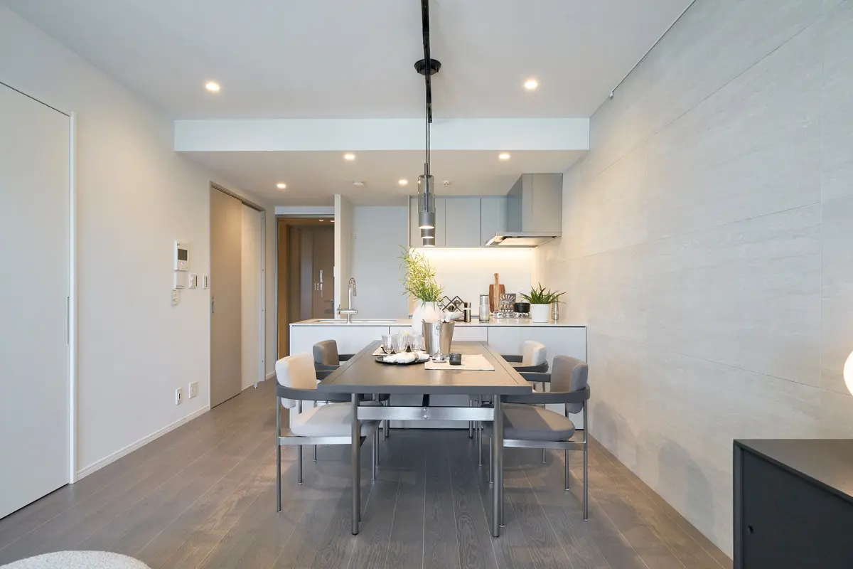 お部屋は17帖超の開放的な縦長LDKを採用しています。フローリング建具には、グレーや暖かい木色を基調としたものを用いて、上品さを感じます。