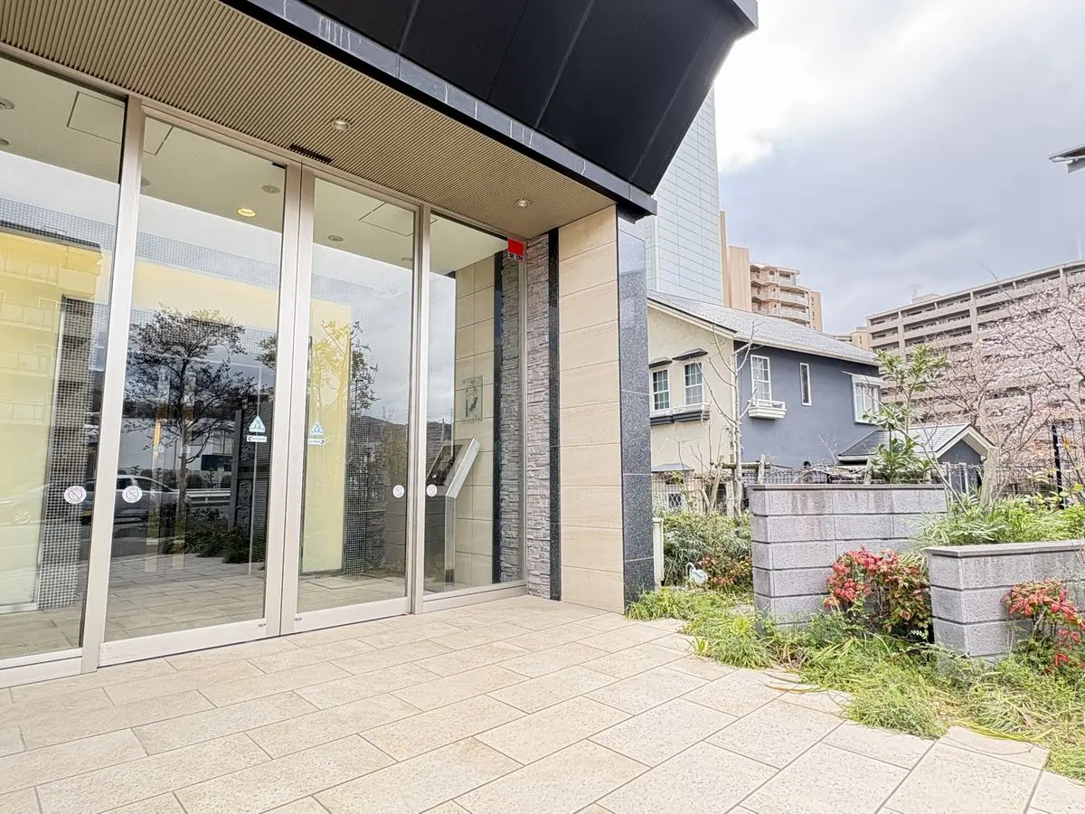 四季の植栽に囲まれたタイル貼りのエントランスアプローチ。歩車分離設計を採用しており、人の導線と車の導線が分けられています。エントランスには、オートロックと宅配ボックスが設置されています。
