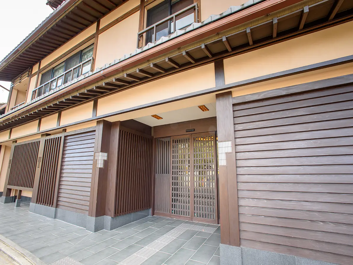 エントランスには壁一面の京友禅ガラス、玄関前には行燈を設置されており雅な空間を演出。