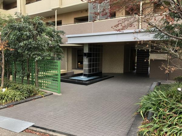 外壁はブラウンとベージュのタイル貼り、エントランスには水盤もありホテルライクな高級感あふれる佇まいです。