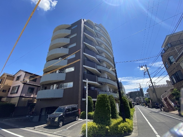マンション外観はシックな色調のタイル貼りでラウンド形状のバルコニーの曲線フォルムが個性的なデザインです。