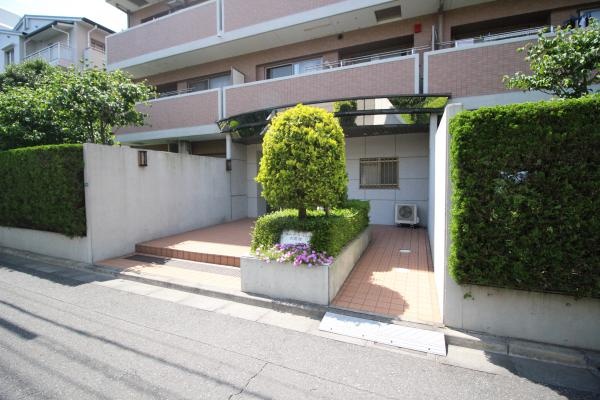スモーキーピンクのタイル貼りにグレーのアクセントの外観のマンションです。メインエントランスとサブエントランスの2か所の出入り口があります。