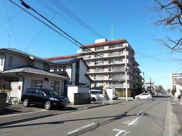 3面を道路に囲まれているため、陽当たり良好。タイル貼りの落ち着いた外観のマンションです。オートロック対応で宅配ボックスもあります。